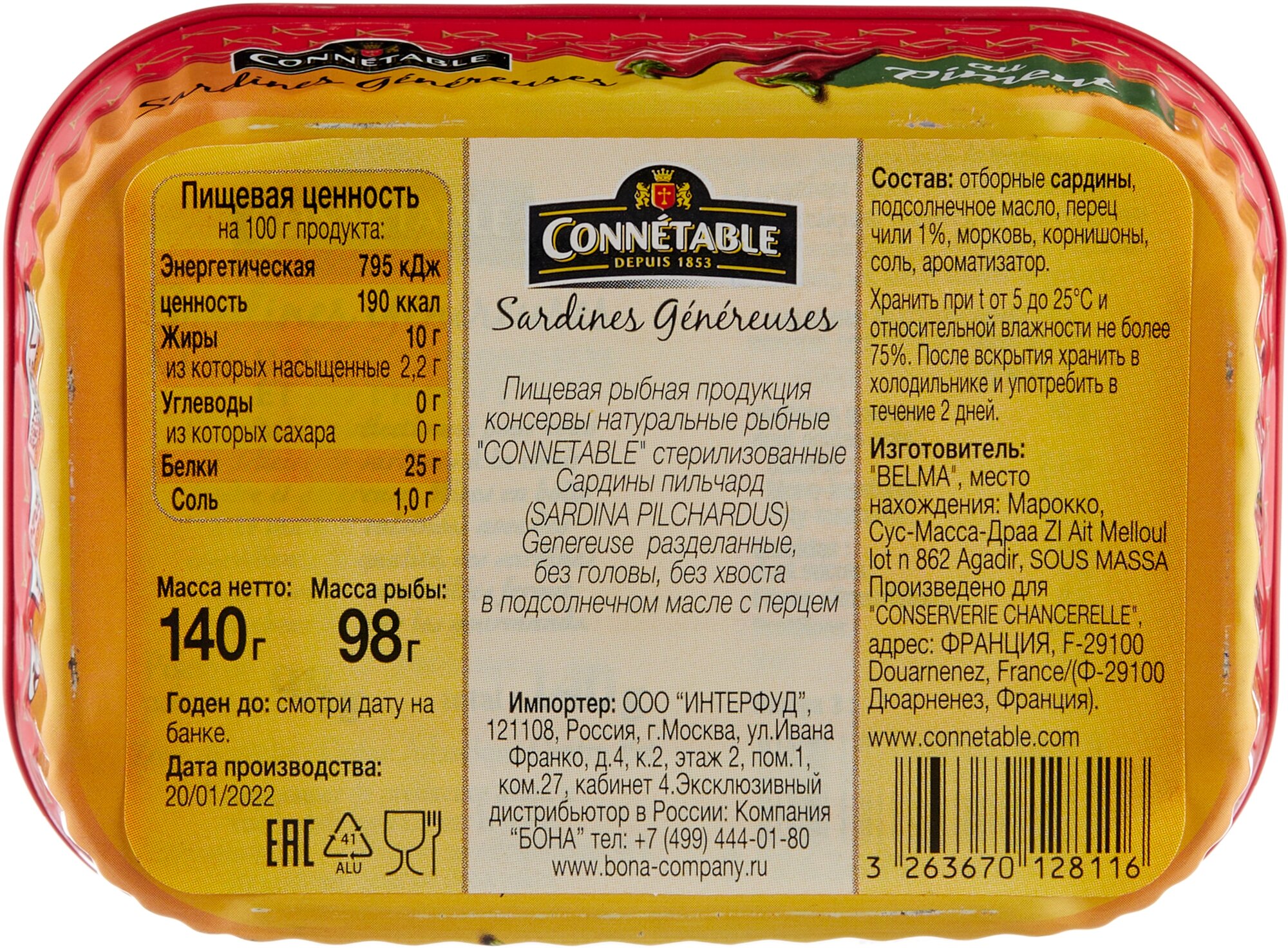 Сардины Connetable Genereuse в оливковом масле с перцем 140г