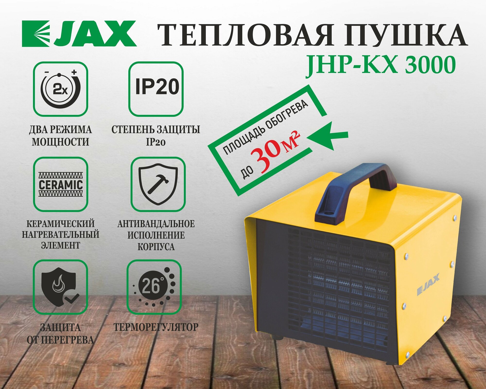 Тепловая пушка JAX (Джакс) оснащена нагревательным элементом керамического типа, который не выжигает кислород из воздуха при работе. Устройство имеет компактные габариты и выполнено в прочном металлическом корпусе. Модель оснащена механическим управлением с возможностью выбора режима мощности.