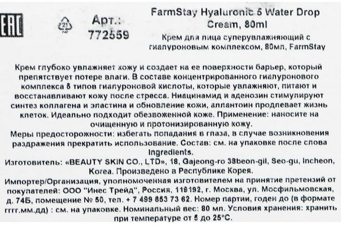 | Коллекция | FarmStay Hyaluronic 5 Water Drop Cream |