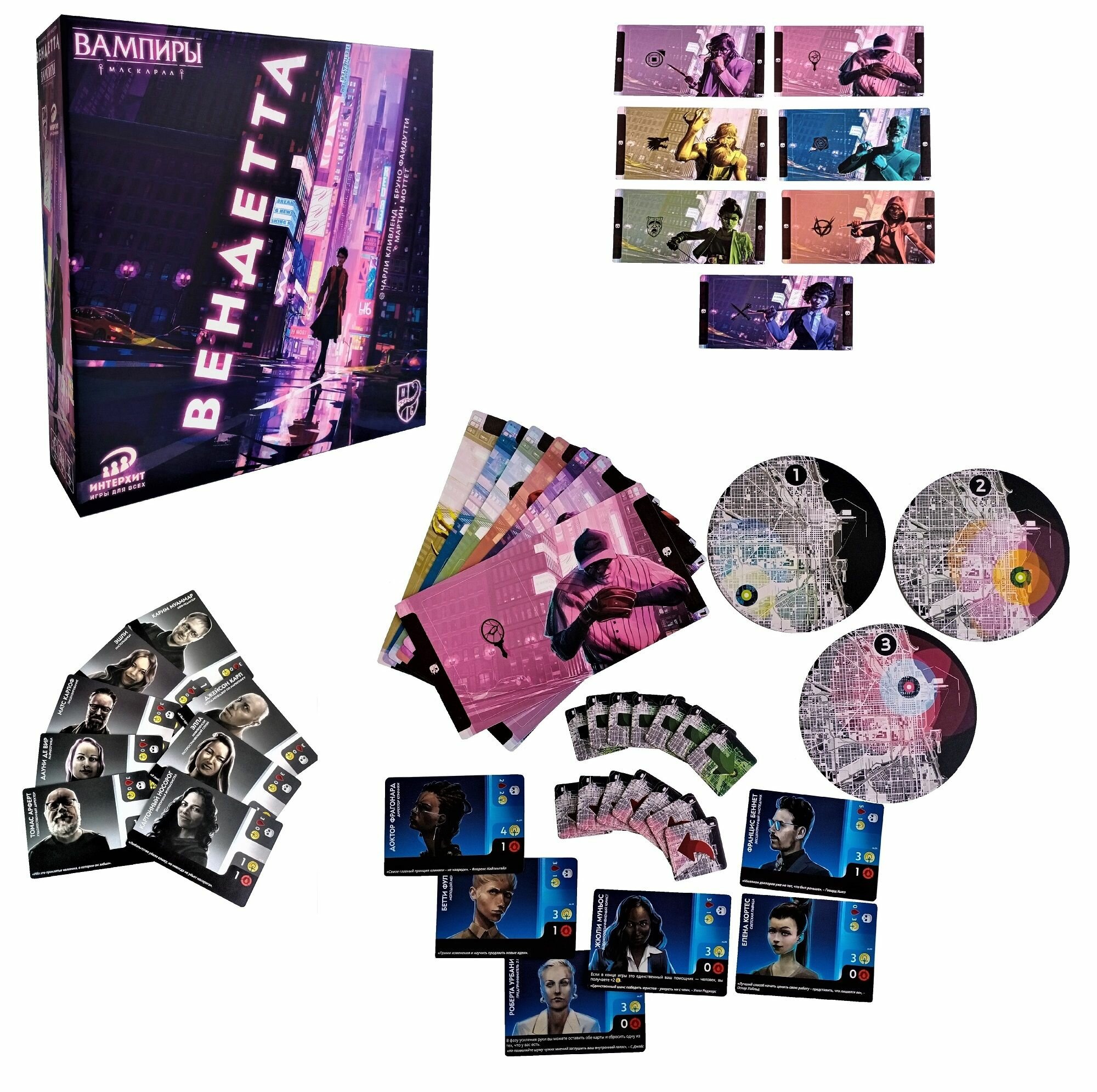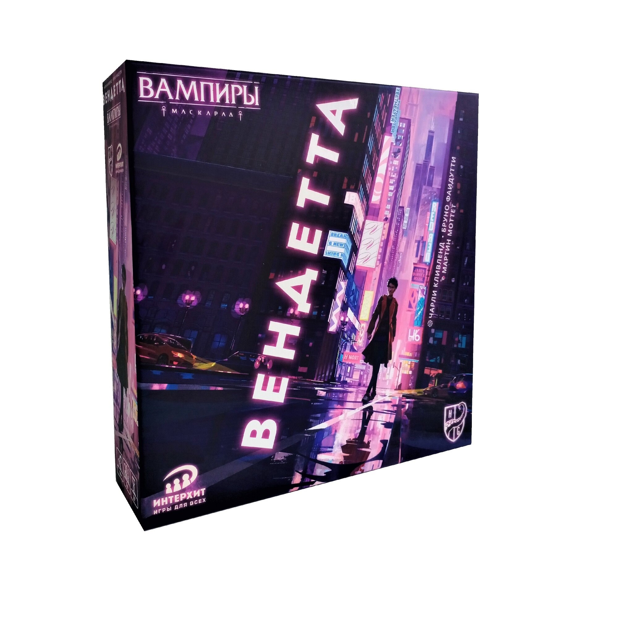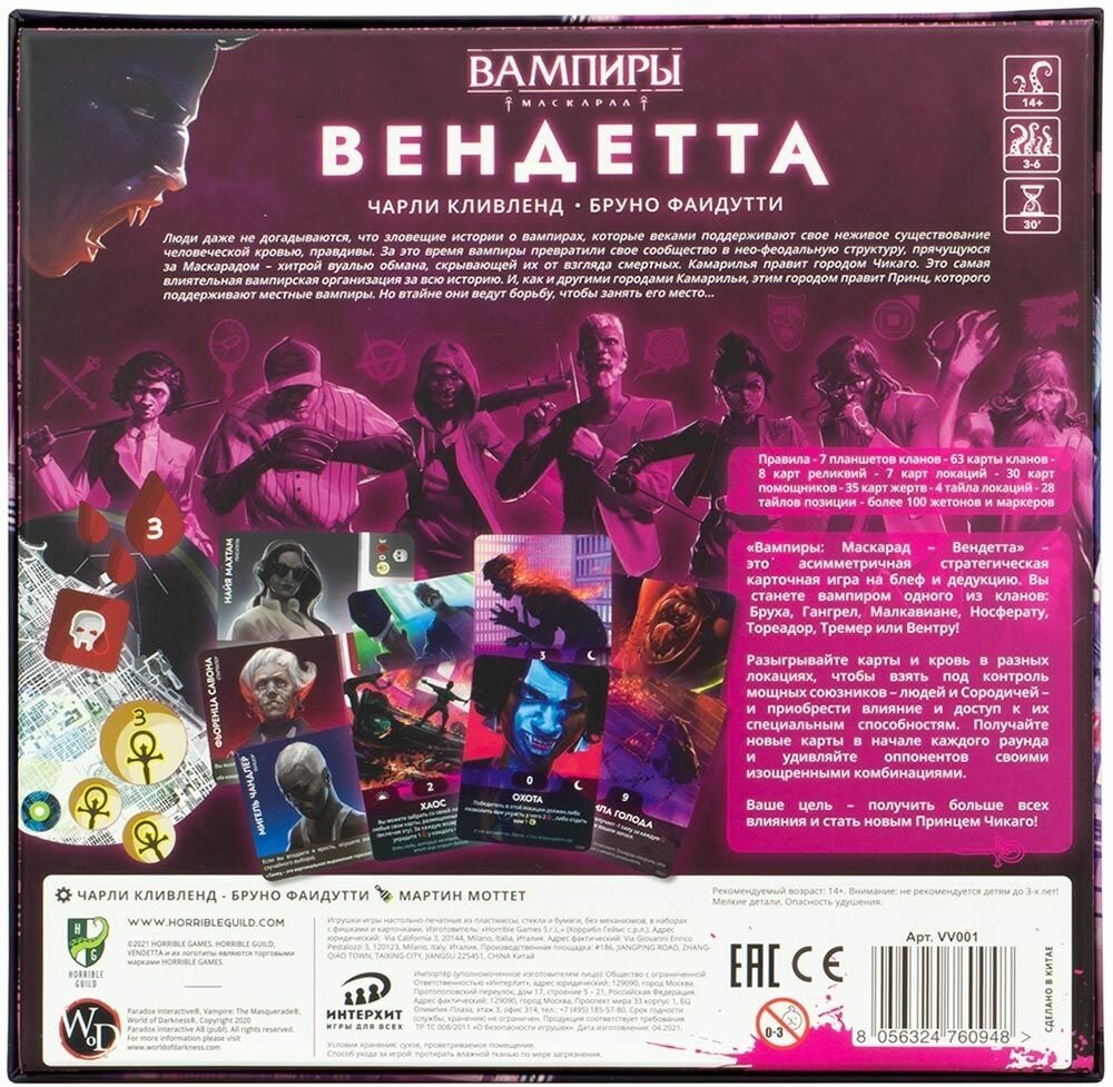 «Вампиры Маскарад. Вендетта» приглашает вас в легендарный Мир Тьмы: мрачное, жестокое, полное тайн и интриг отражение нашей с вами современности. На ночных улицах его мегаполисов охотятся оборотни, в конференц-залах небоскрёбов собираются тайные общества магов, и даже в центре людной толпы легко можно почувствовать на себе леденящий взгляд призрака. Перед вами дверь в мир, в котором сверхъестественное стало реальностью – мир, в котором могущественные сущности ведут бесконечную борьбу за власть над человечеством. Готовы ли вы вступить в игру?«Вендетта» – это увлекательная игра про захват территорий, блеф и предательство. Вы – вампиры, бессмертные правители ночи, и вам предстоит укрепить своё могущество. Возьмите на себя лидерство в одном из семи великих кланов, боритесь за влиятельных смертных союзников, помощников и слуг, плетите интриги… и не забывайте подпитывать собственные силы живительной кровью!Каждый игрок получит уникальную колоду карт. Эти карты будут отражать особенности вашего клана, однако не всех из них будут доступны вам сразу. В течение трёх эпох (игровых раундов) вам предстоит разобраться в том, на что способны карты ваших оппонентов, и найти способ им противодействовать – а заодно не дать противникам изучить ваши возможности. Начните своё восхождение к политическим вершинам Мира Тьмы сегодня!
