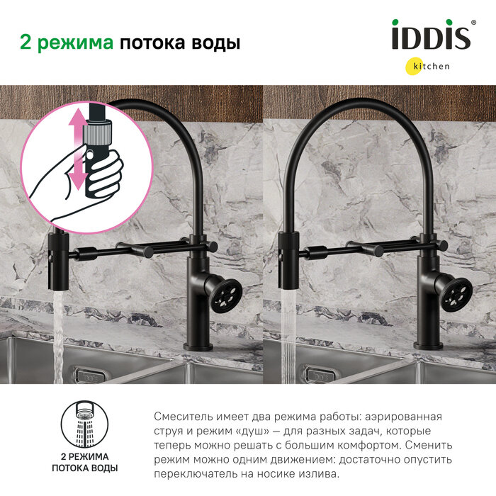 Им удобно пользоваться для любых повседневных дел на кухне. Мягкий поток воды из крана, к тому же можно переключить на режим душевой лейки. Поверхность такая: что приятно прикасаться. Такая же модель есть еще и в другом цвете, но черный матовый как мне кажется получше смотрится.