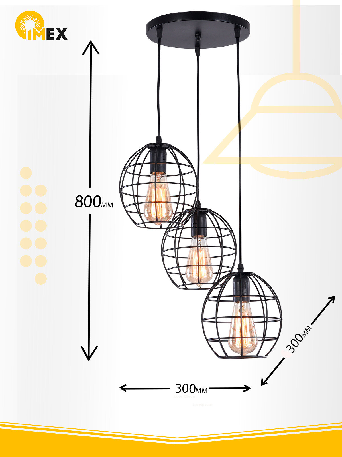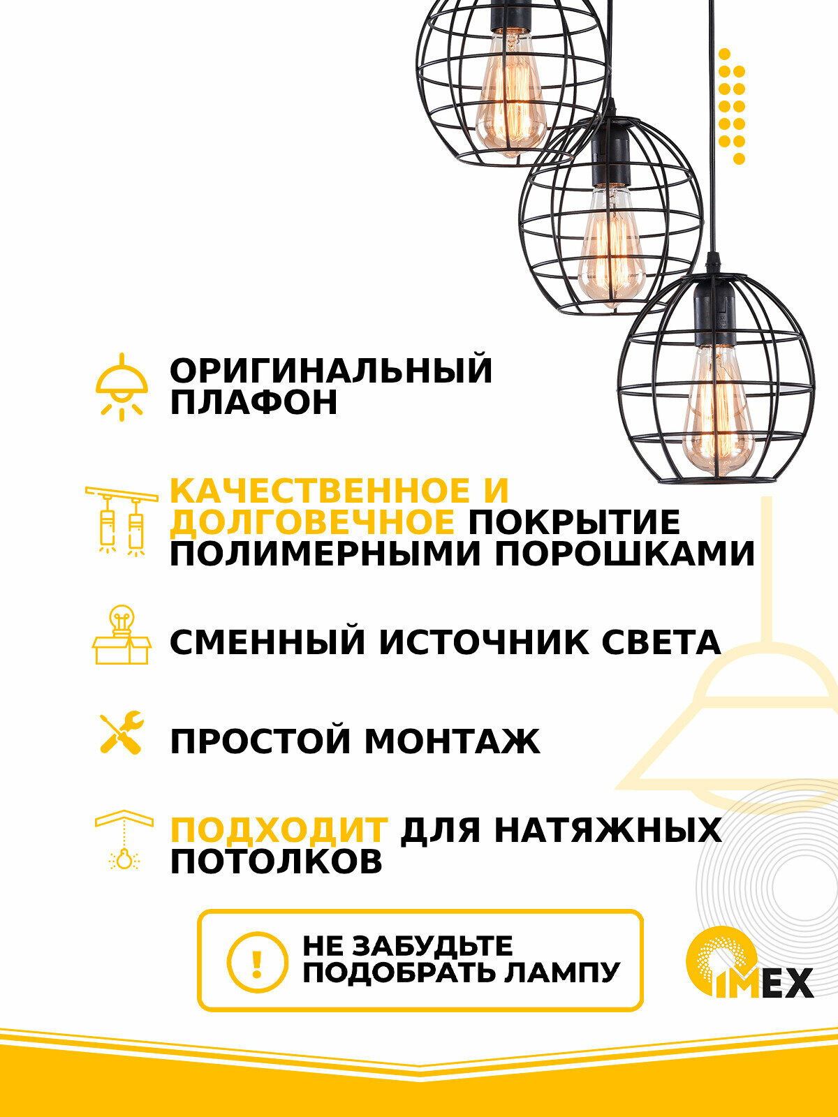 Подвесной светильник - продукт известной компании Imex (Германия). Имеет максимальную мощность 180 Вт, освещает площадь до 9 кв. м. Отлично подойдет для таких мест, как гостиная, прихожая и коридор, кафе, кухня, над кухонным островом, офис. Впишется в интерьеры следующих стилей: лофт.