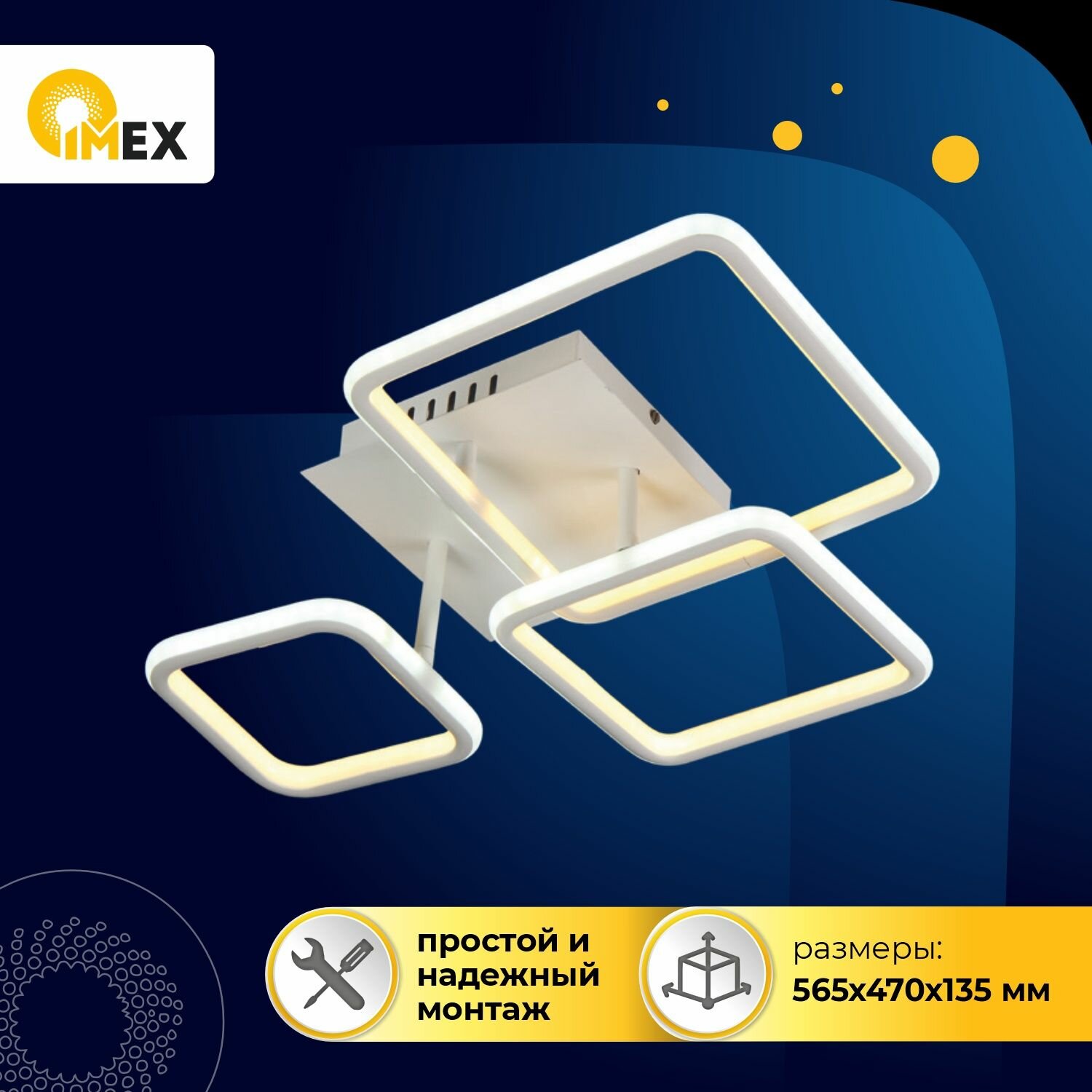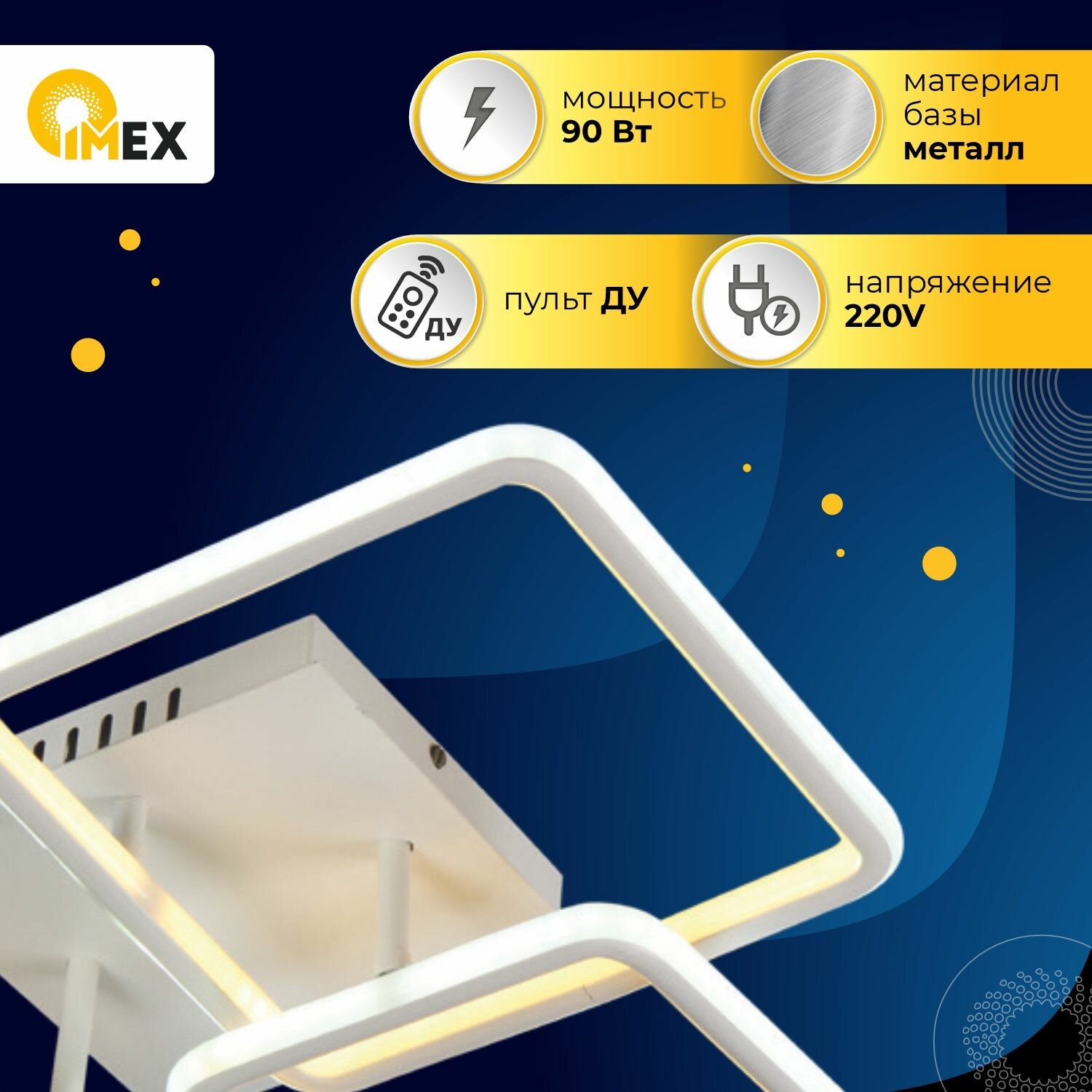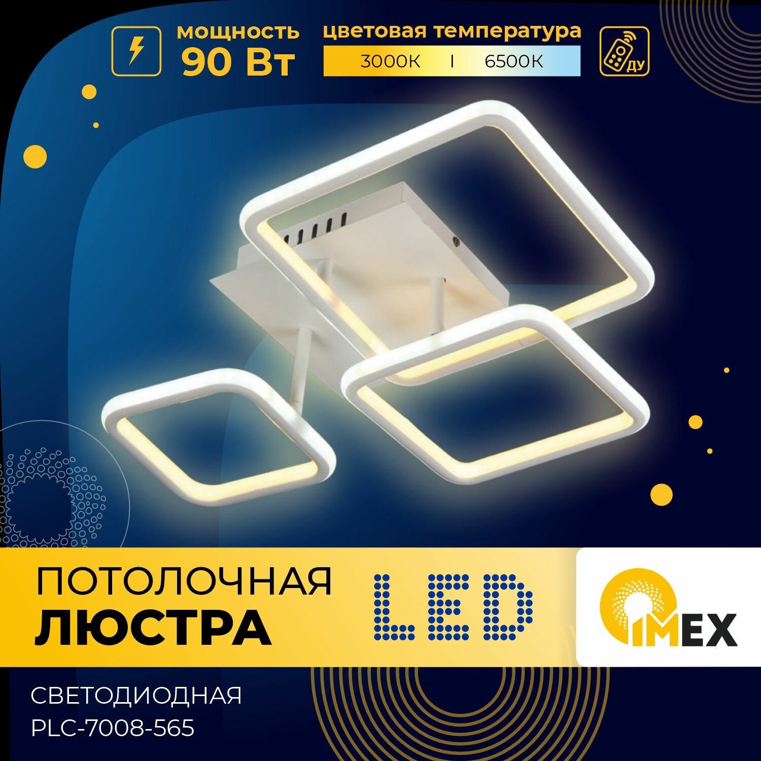 Потолочная светодиодная люстра с пультом - продукт известной компании Imex (Германия). Имеет максимальную мощность 90 Вт, освещает площадь до 18 кв. м. Отлично подойдет для таких мест, как гостиная, спальня, кухня. Впишется в интерьеры следующих стилей: современный, хай-тек.