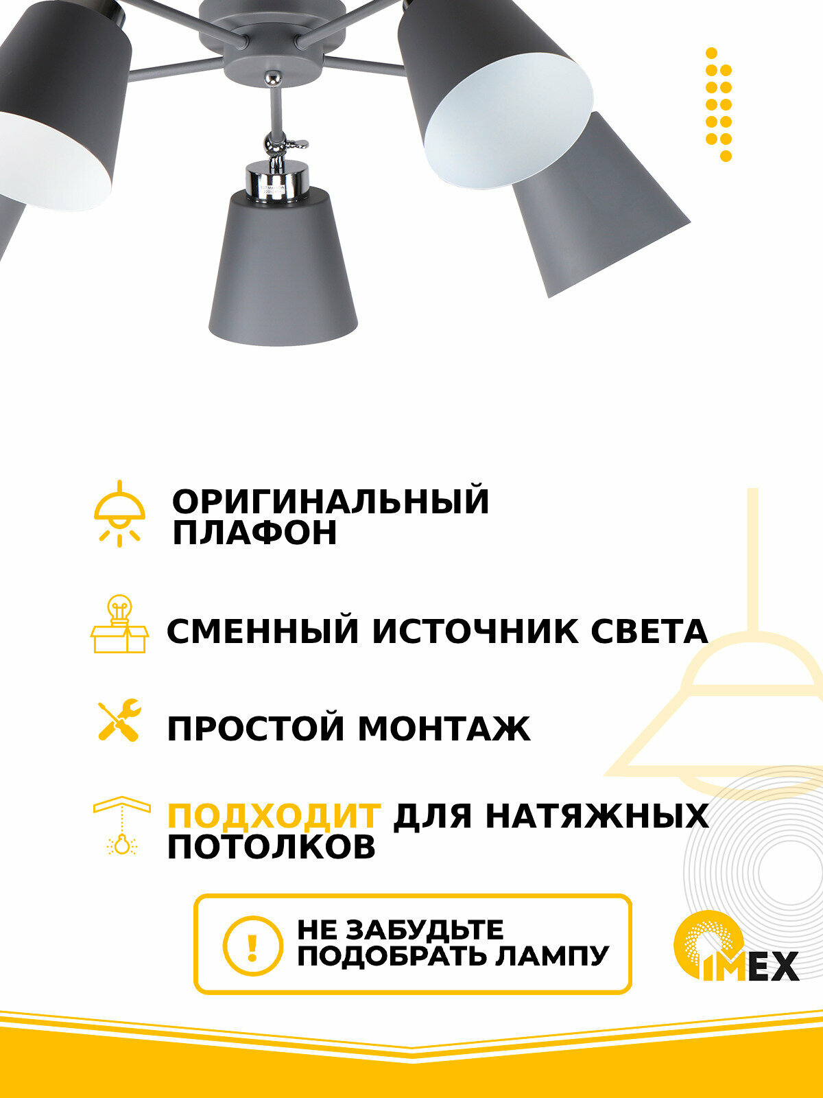 Потолочная люстра - продукт известной компании Imex (Германия). Имеет максимальную мощность 60 Вт, освещает площадь до 15 кв. м. Отлично подойдет для таких мест, как гостиная, спальня, кухня. Впишется в интерьеры следующих стилей: скандинавский.