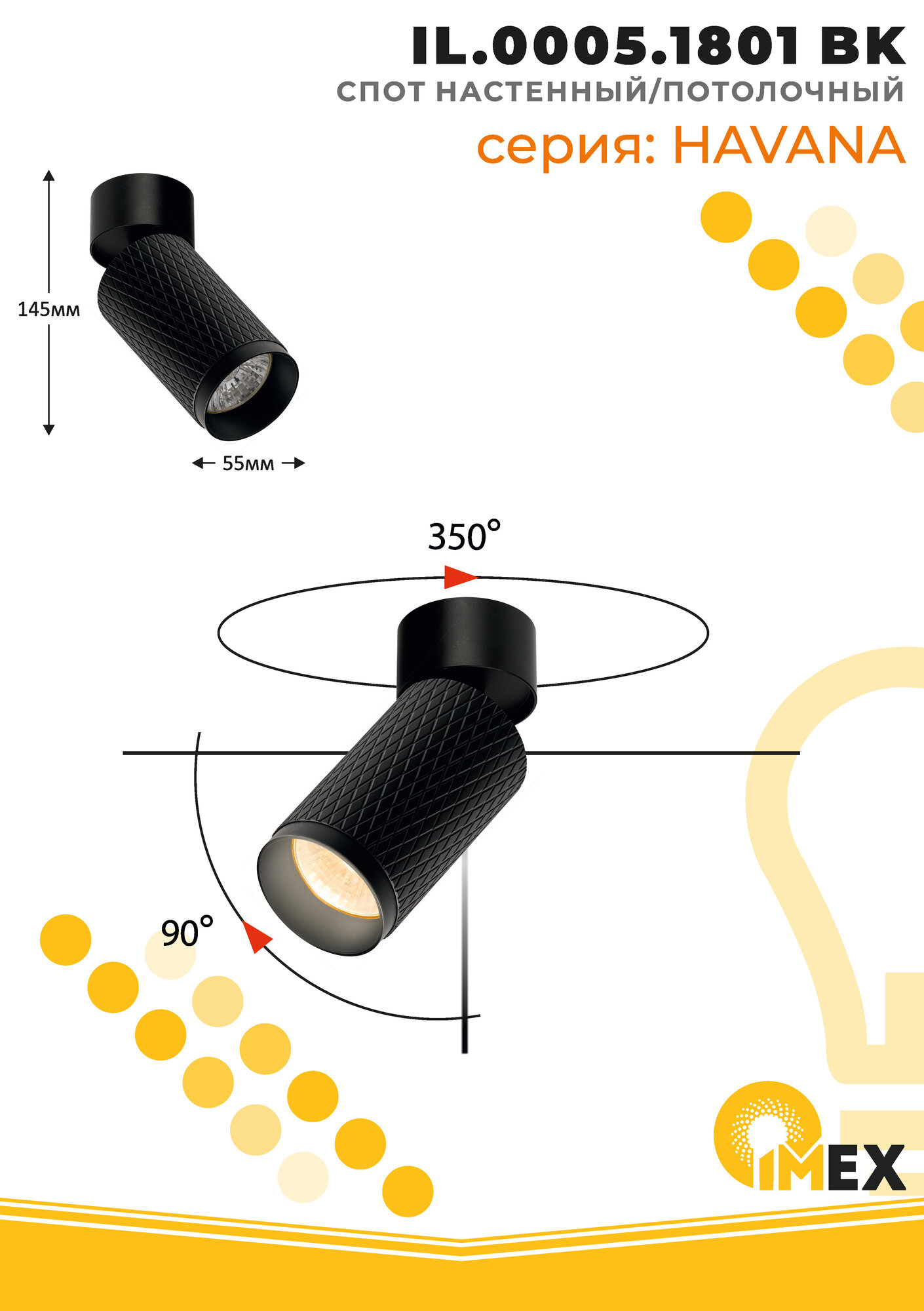 Спот Havana - продукт известной компании Imex (Германия). Имеет максимальную мощность 50 Вт. Отлично подойдет для таких мест, как гостиная, прихожая и коридор, спальня. Впишется в интерьеры следующих стилей: техно.