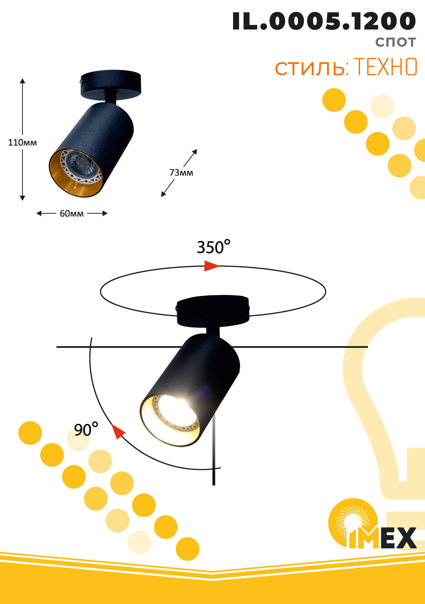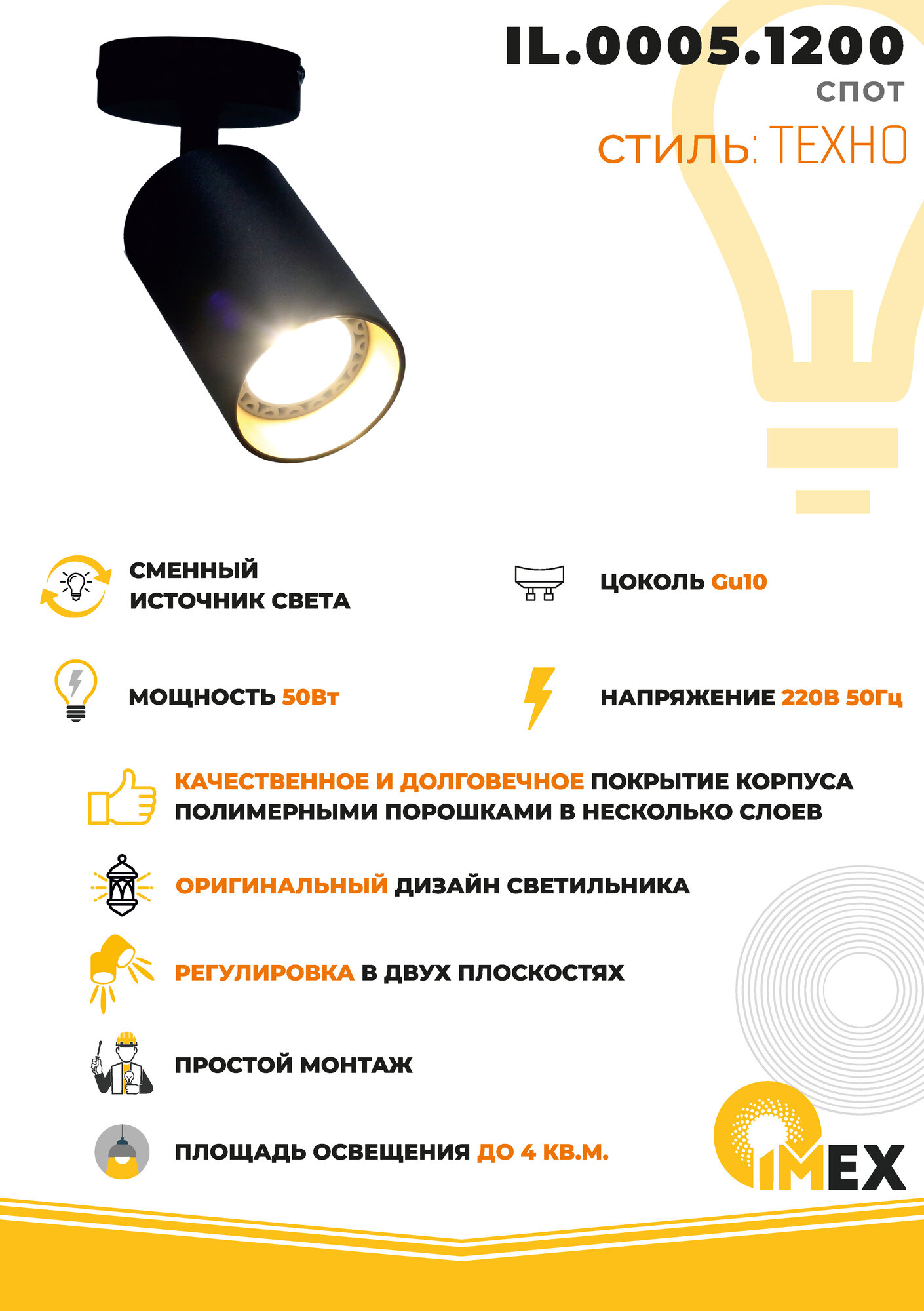 Спот - продукт известной компании Imex (Германия). Имеет максимальную мощность 50 Вт, освещает площадь до 4 кв. м. Отлично подойдет для таких мест, как гостиная, кафе, кухня, кабинет, офис, экспозиция, магазин. Впишется в интерьеры следующих стилей: техно.