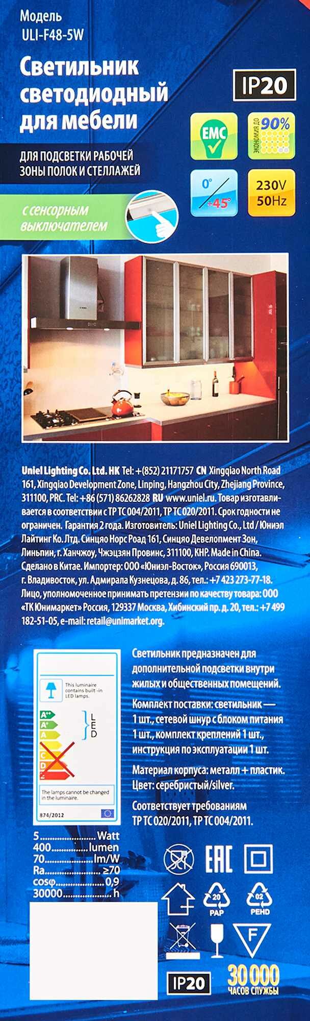**Светильник светодиодный Uniel F48** предназначен для эксплуатации внутри помещений. Не выдерживает условий высокой влажности (соответствует классу IP20). Используется в качестве подсветки. Может крепиться к кухонному или мебельному шкафу, стене. Изучает холодный белый свет.