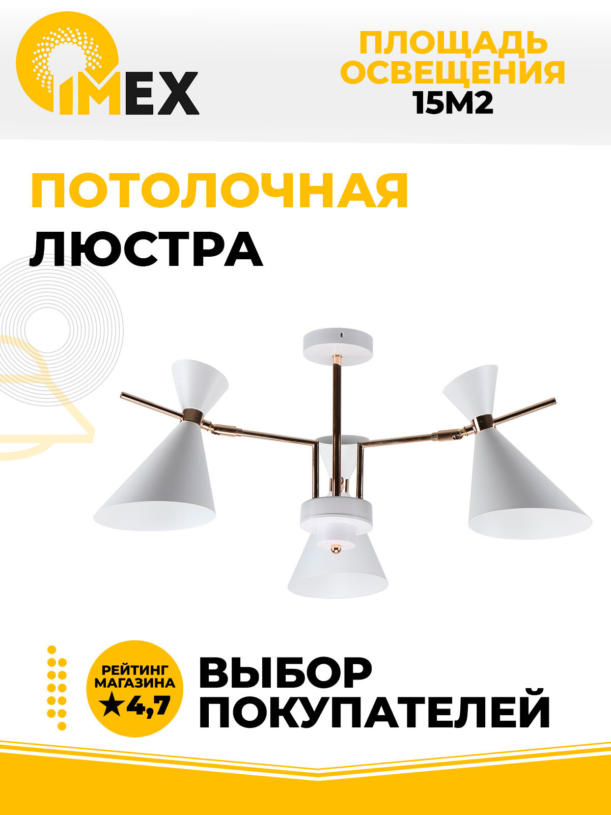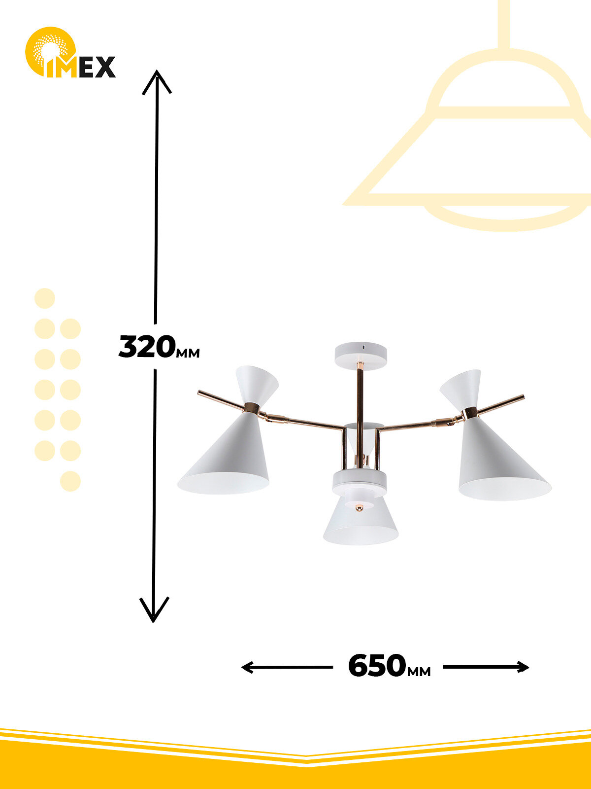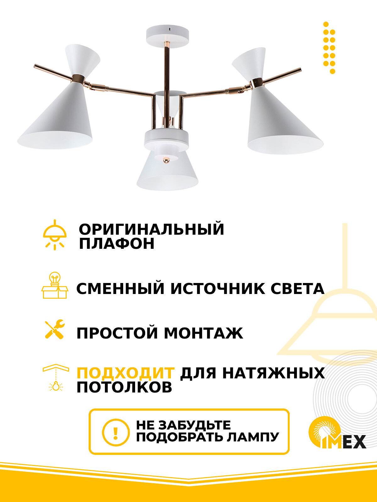 Потолочная люстра - продукт известной компании Imex (Германия). Имеет максимальную мощность 300 Вт, освещает площадь до 15 кв. м. Отлично подойдет для таких мест, как гостиная, спальня, кухня. Впишется в интерьеры следующих стилей: скандинавский.
