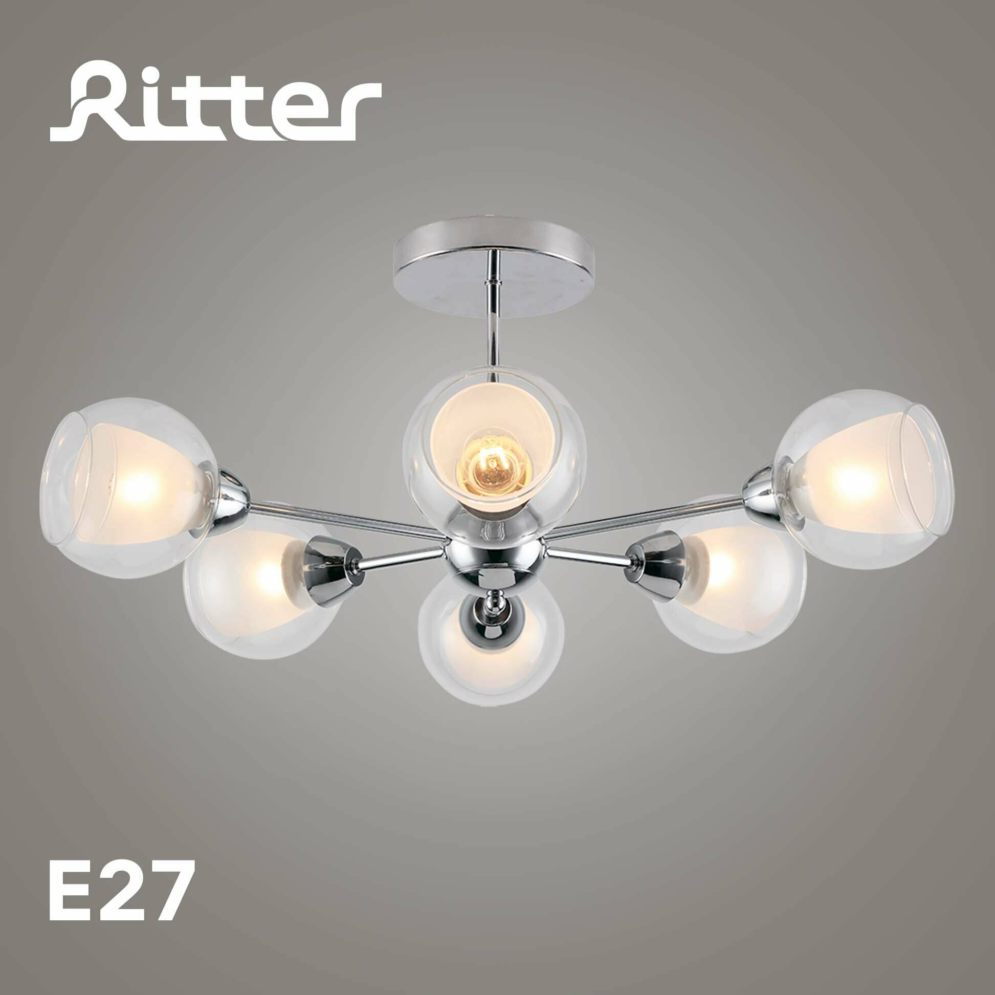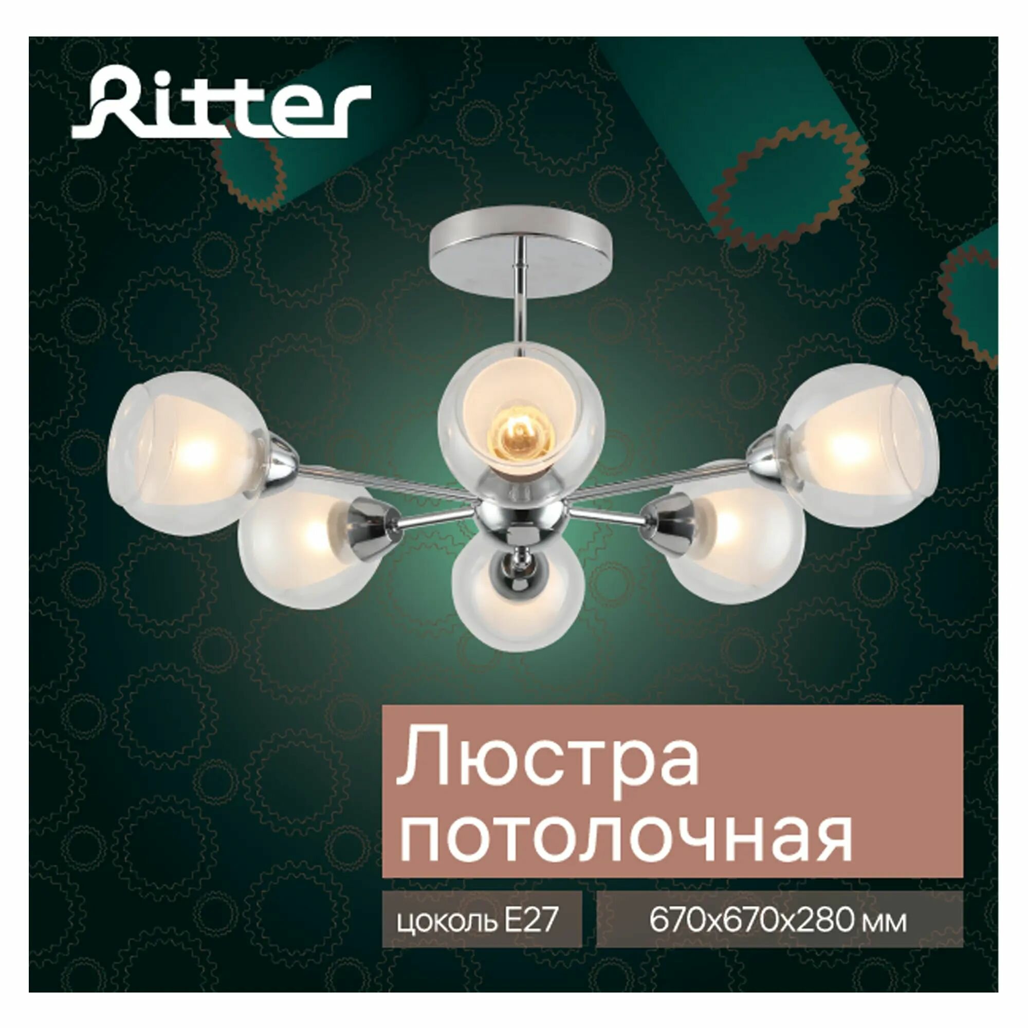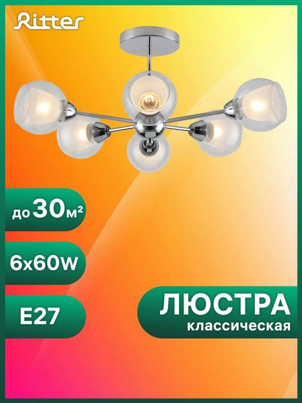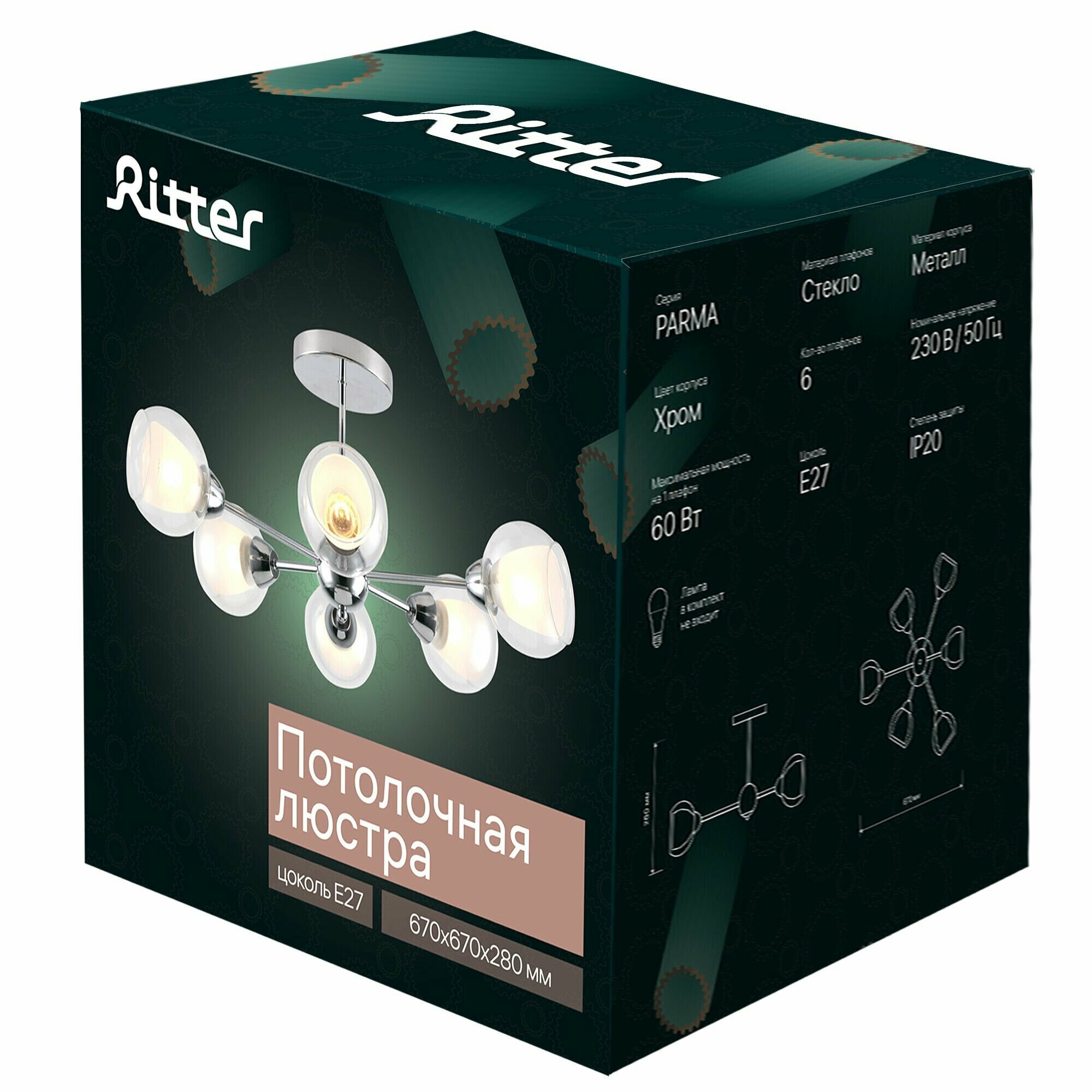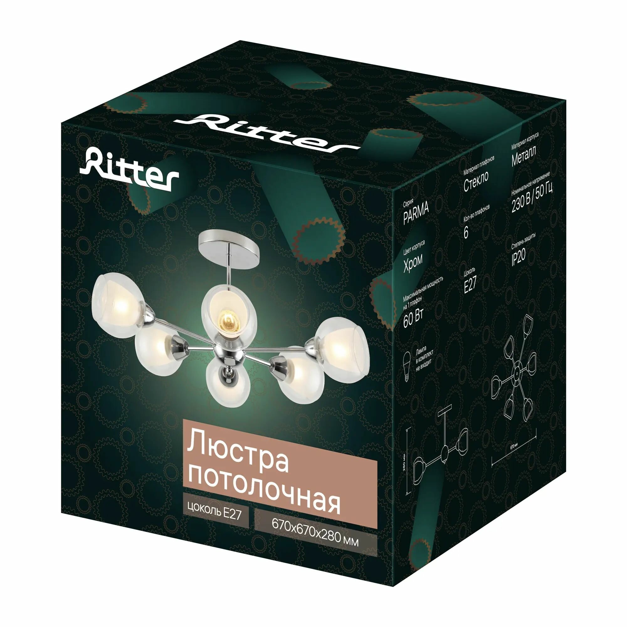 Потолочная люстра Ritter серии PARMA со стандартным цоколем E27 для светодиодных ламп или ламп накаливания. Надежное металлическое основание и классические плафоны из стекла - для равномерного освещения жилых помещений. Оригинальное расположение и дизайн плафонов не позволят люстре затеряться в интерьере. Она станет завершающим штрихом пространства в классическом стиле или вдохновит на новые дизайнерские свершения.Кол-во плафонов: 6. Цоколь: E27. Цвет корпуса: хром. Материал корпуса: металл. Материал плафонов: стекло. Макс. мощность на 1 плафон 60 Вт. Напряжение 230 В / 50 Гц. Размер: 670х670х280 мм