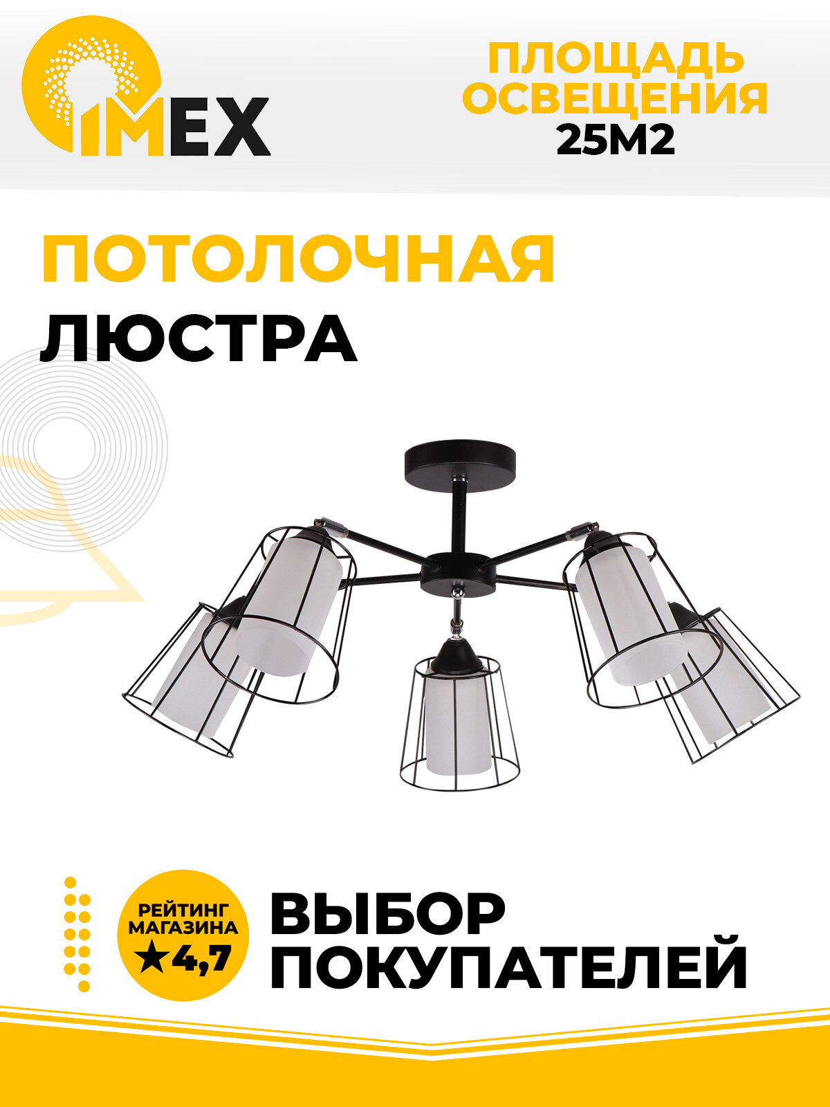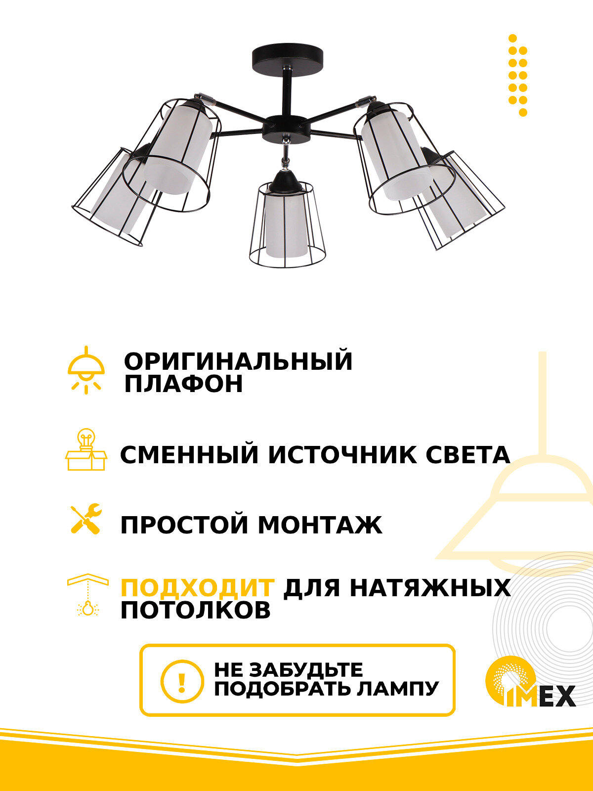 Потолочная люстра - продукт известной компании Imex (Германия). Имеет максимальную мощность 300 Вт, освещает площадь до 15 кв. м. Отлично подойдет для таких мест, как гостиная, кабинет, кухня. Впишется в интерьеры следующих стилей: модерн.
