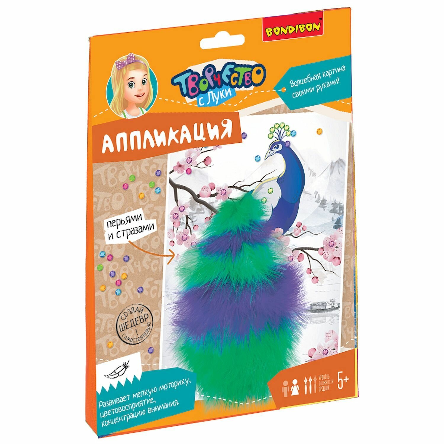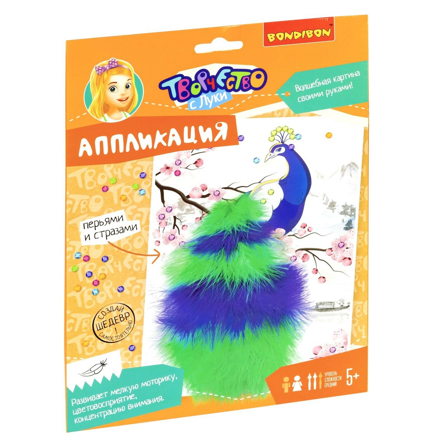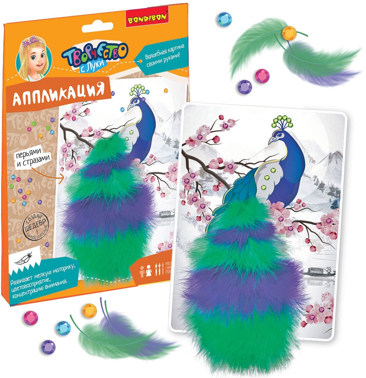 Волшебная картина своими руками! Аппликация "ПАВЛИН" с перьями и стразами от Bondibon - яркие возможности для детского творчества и развития!