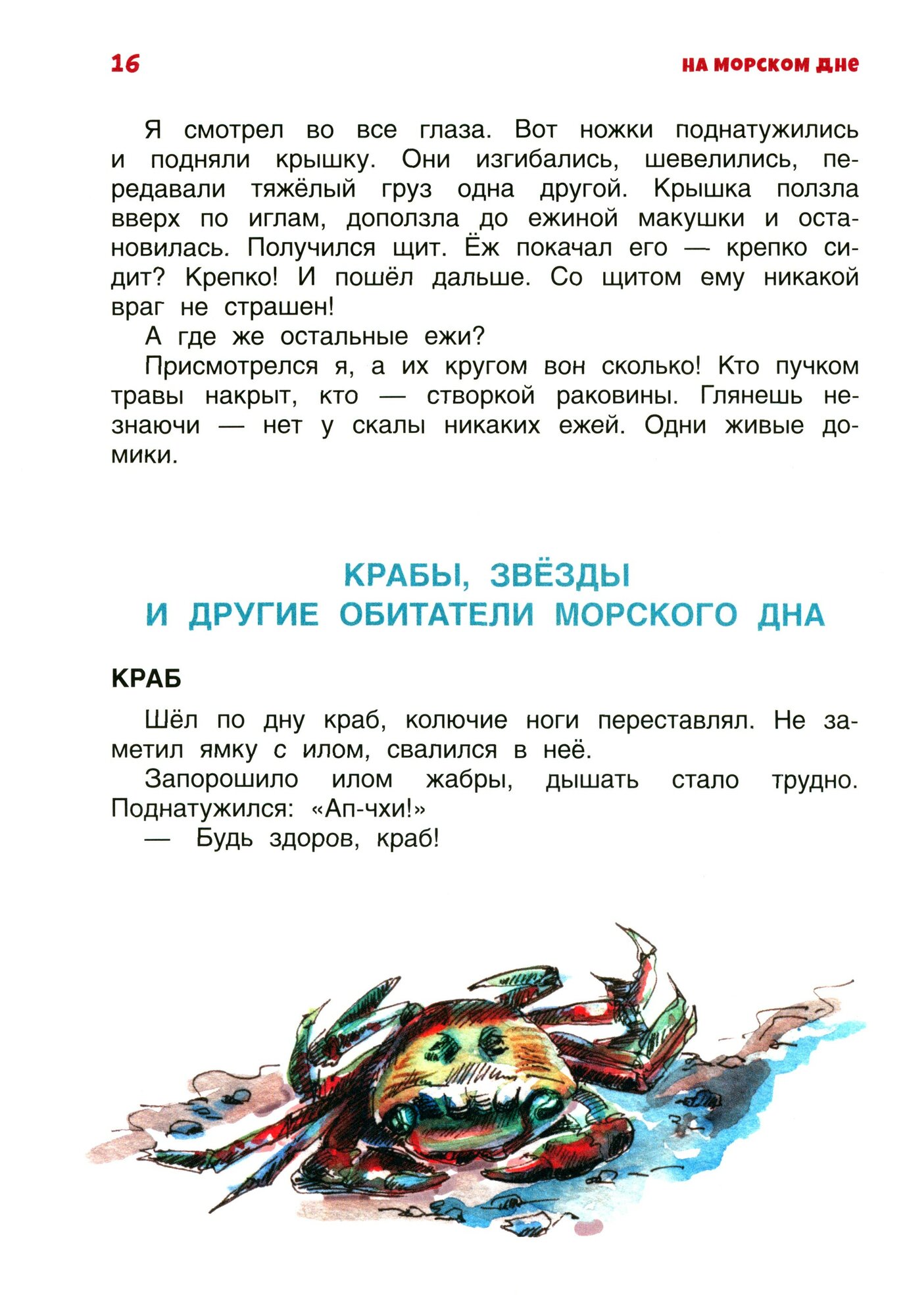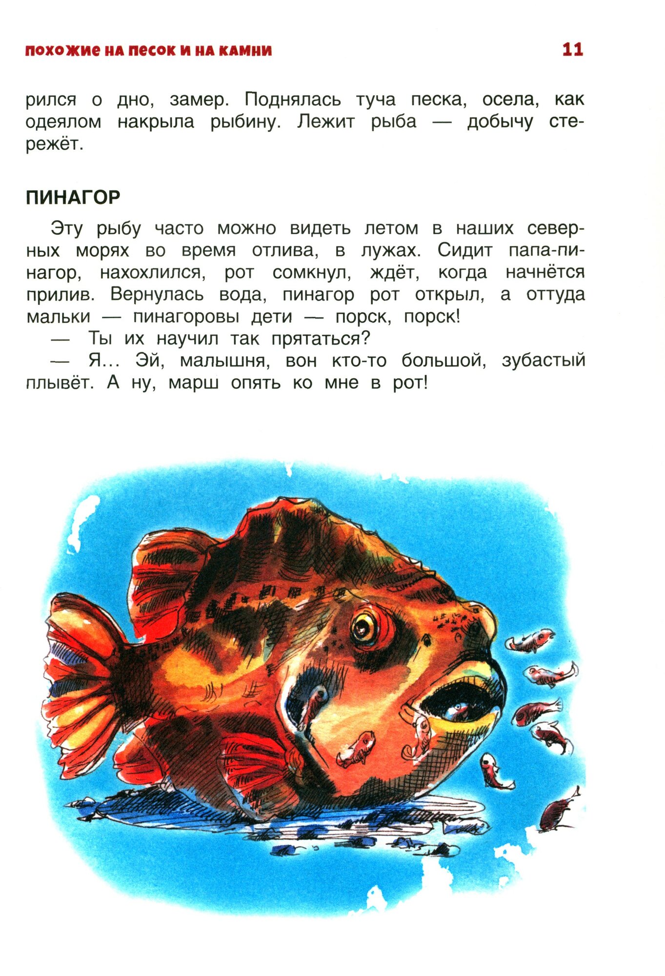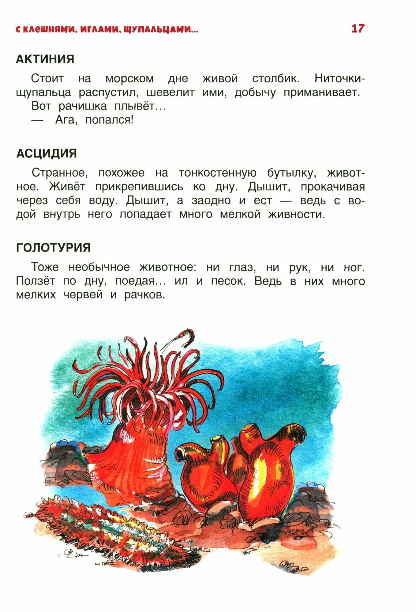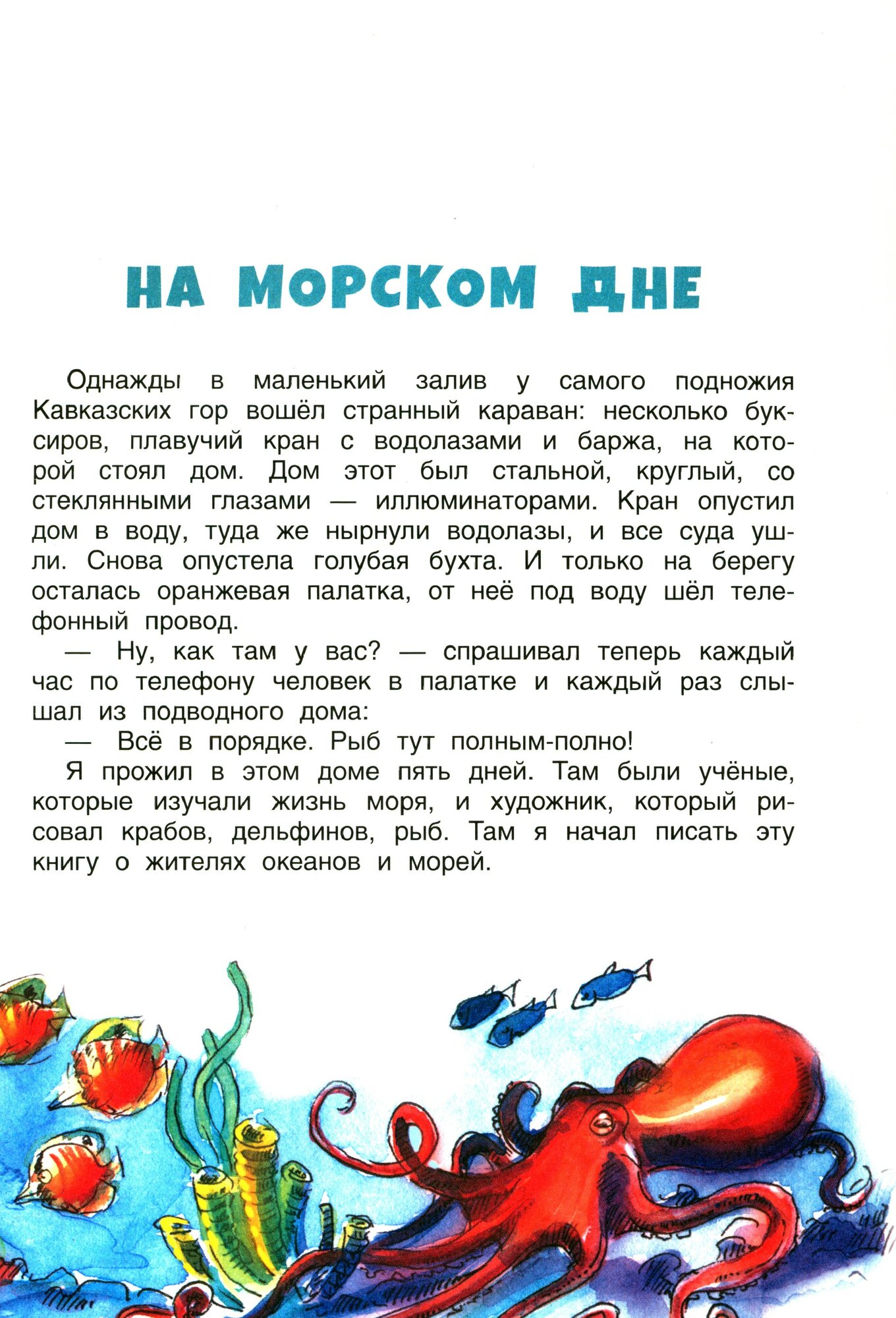 Рассказал о них Святослав Сахарнов - человек, которому приходилось много плавать на кораблях и погружаться под воду, видеть диковинных рыб и их соседей - ежей, крабов... Он участвовал в экспедициях в Арктику, на Командорские и Курильские острова, на Кубу и даже жил в заповедниках Танзании и Индии.