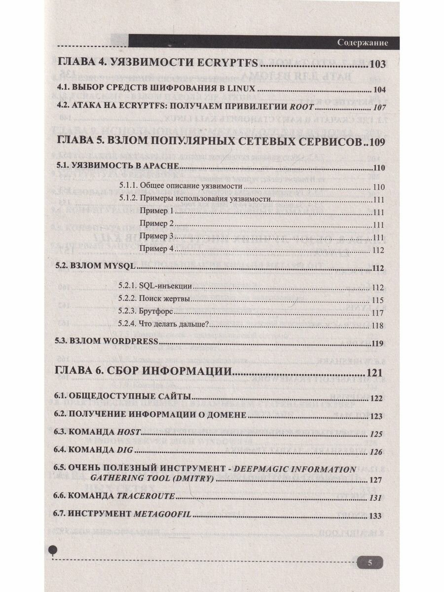 Первая часть книги показывает, как взломать саму Linux - вы познакомитесь с основами Linux; узнаете, как взломать локальную Linux-систему и получить права roof, поговорим о различных уязвимостях в системе шифрования файлов и папок eCryptfs; ну и, в заключение первой части, будет показано как взломать Apache, MySQL, а также CMS WordPress.