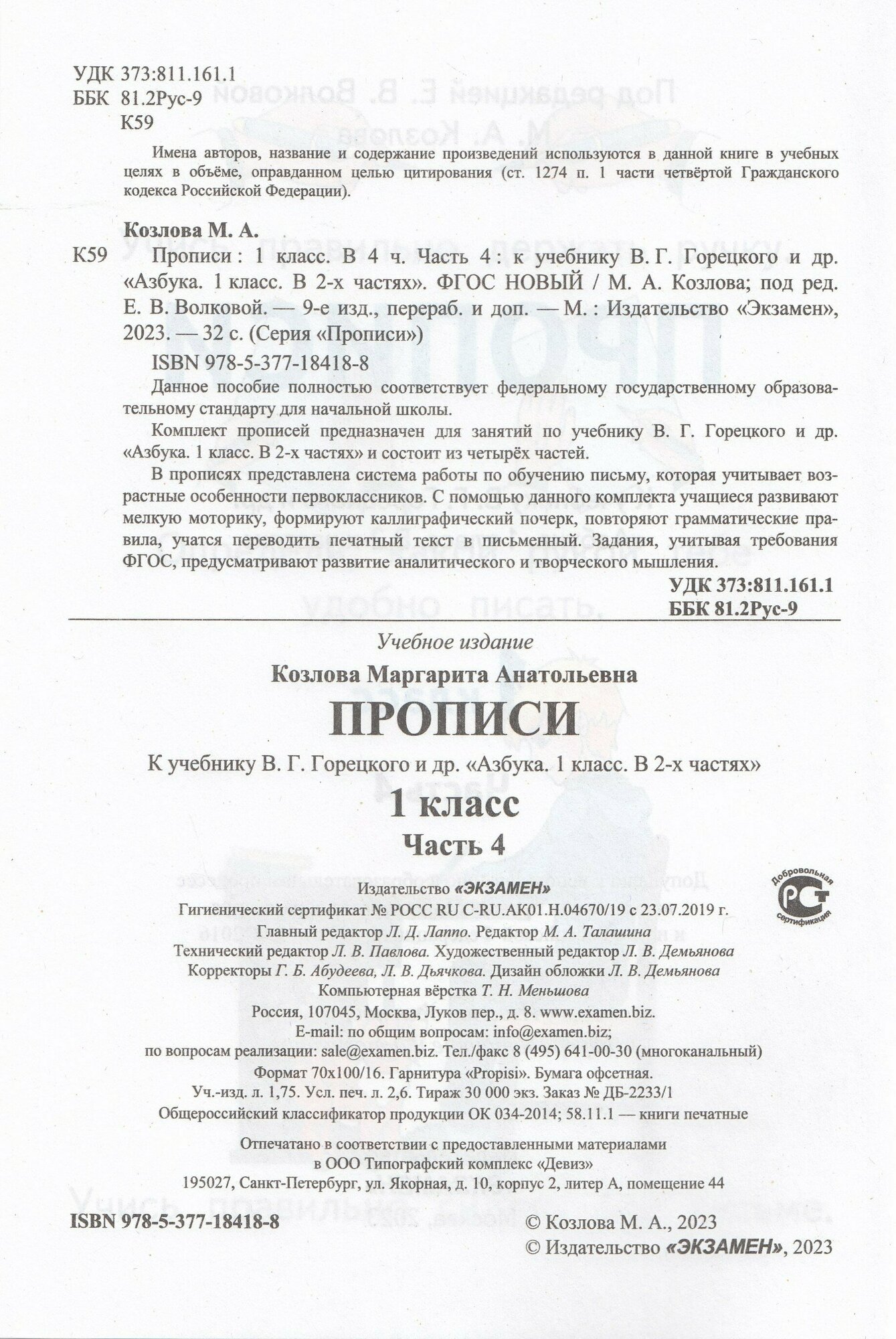 Сервис сравнения цен СкидкаГИД предлагает сравнить цены на товар «Книга: Прописи 1 класс Часть 4 К учебнику В Г Горецкого и др Азбука 1 класс В 2-х частях (Маргарита Анатольевна Козлова); Экзамен, 2023»