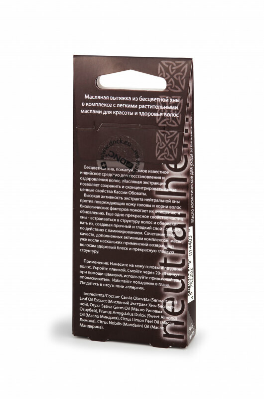 Бесцветная хна, пожалуй, самое известное индийское средство для восстановления и оздоровления волос. Масляная экстракция позволяет сохранить и сконцентрировать самые ценные свойства Кассии Обоваты. Высокая активность экстракта нейтральной хны против повреждающих кожу головы и корни волос биологических факторов помогает их очищению и обновлению. Еще одно прекрасное свойство частиц хны - встраиваться в структуру волос и обволакивать их, создавая прочный и гладкий слой - сходно по действию с ламинированием. Сочетание этих качеств, дополненных активным комплексом масел, уже после нескольких применений возвращают волосам здоровый блеск и прекрасную гладкую структуру.Способ применения:Нанесите на кожу головы и по длине волос. Укройте пленкой. Смойте через 20-30 минут при помощи шампуня, используйте привычный вам ополаскиватель. Избегайте попадания в глаза. Убедитесь в отсутствии аллергии.Состав:Cassia Obovata (Senna Italica) Leaf Oil Extract (Масляный Экстракт Хны Бесцветной), Oryza Sativa Germ Oil (Масло Рисовых Отрубей), Prunus Amygdalus Dulcis (Sweet Almond) Oil (Масло Миндаля), Citrus Limon Peel Oil (Масло Лимона), Citrus Nobilis (Mandarin) Oil (Масло Мандарина).