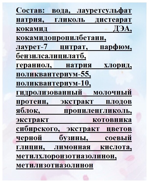 Состав: aqua, cetearyl alcohol, behentrimonium chloride, behenamidopropyl dimethylamine, phenoxyethanol, methylparaben, ethylparaben, propylparaben, pyrus malus (apple) fruit extract, propylene glycol, parfum, benzyl salicylate, lactic acid, hydrolyzed milk protein, guar hydroxypropyltrimonium chloride, sambucus nigra (elder) flower extract, glycine soja (soybean) oil