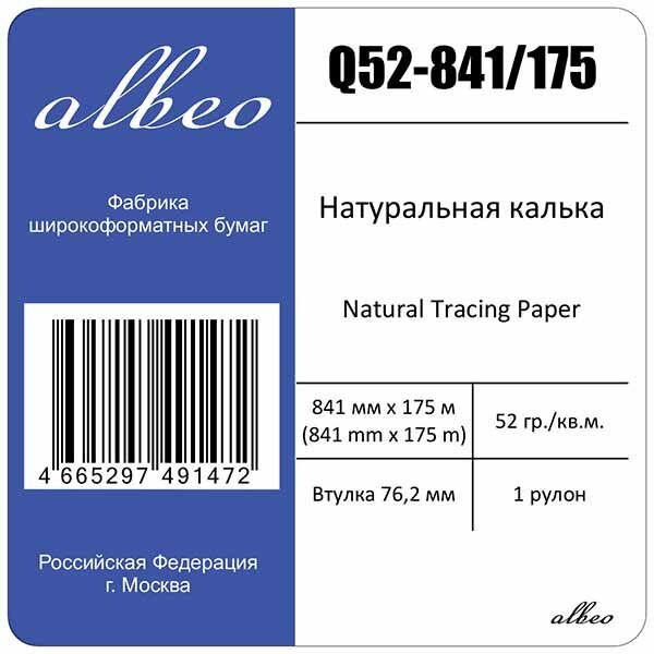 Рулонная калька для печати Albeo Engineer tracing paper 52 г/м2, 0.841x175 м, 76.2 мм (Q52-841/175)