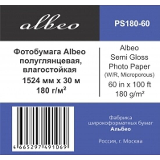 Фотобумага полуглянцевая влагостойкая Semi-Gloss Photo Paper 180 г/м2 1.524x30 м 50.8 мм (PS180-60) Albeo