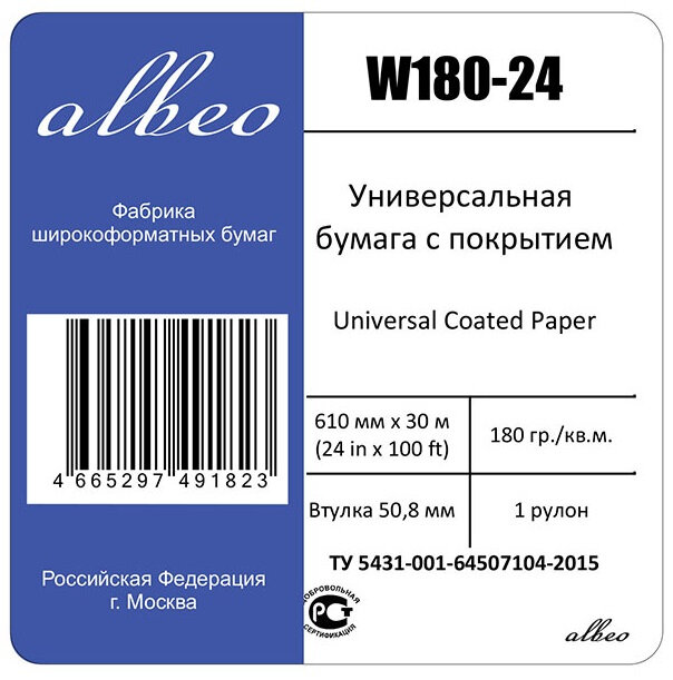Рулонная бумага для плоттера с покрытием Albeo InkJet Coated Paper-Universal 0.610х30.5 м.,180 г/кв.м (W180-24)