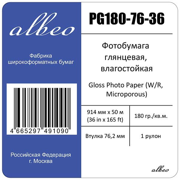 Фотобумага глянцевая влагостойкая Gloss Photo Paper W/R Microporous 180 г/м2 0.914x50 м 76.2 мм (PG180-76-36) Albeo
