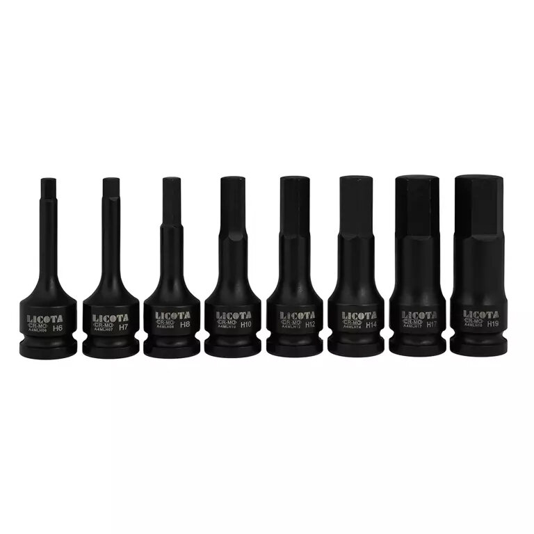 Набор ударных шестигранников Licota ASA-40001 из хром-молибденовой стали, 8 внешних шестигранников размерами от 6 до 19 мм. Комплект предназначен для монтажа резьбового крепежа. Чаще всего используются при работе с ударным гайковертом. Размер привода — ½ дюйма (12,7 мм).