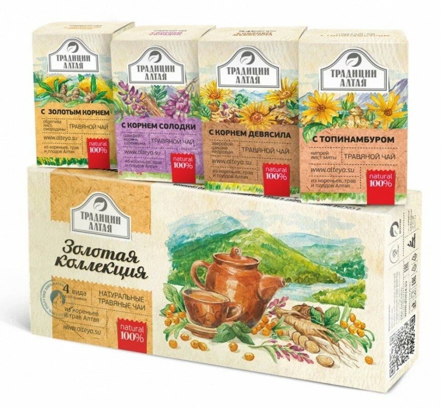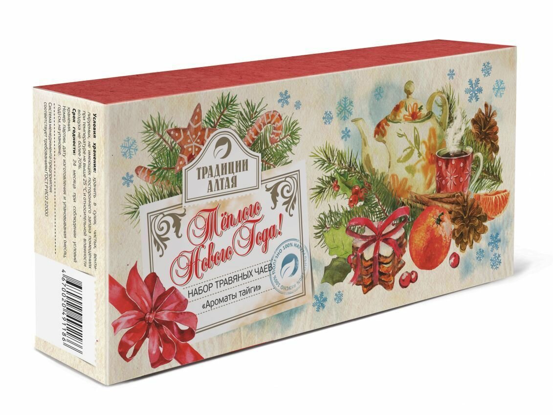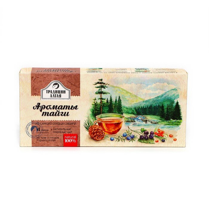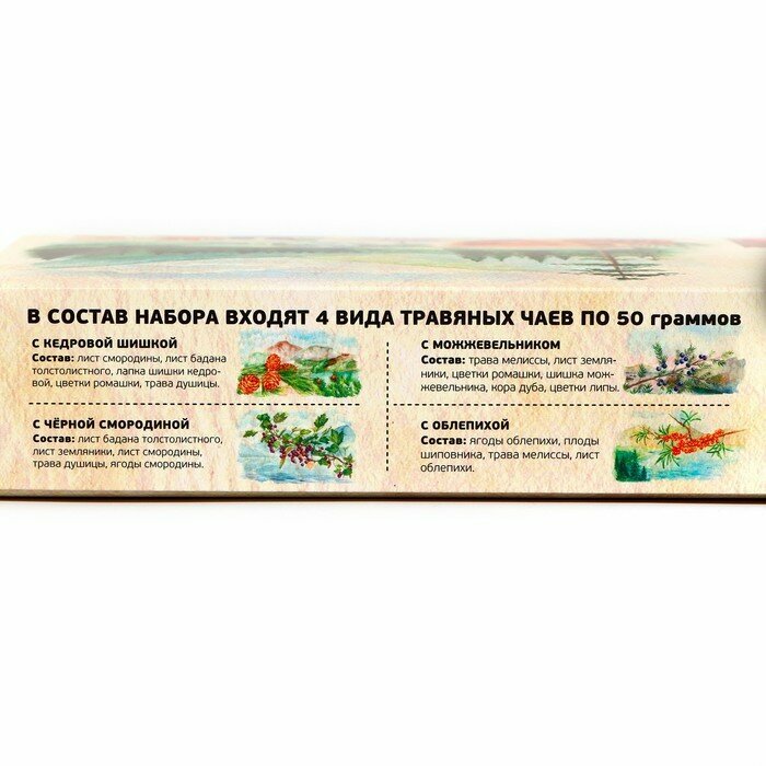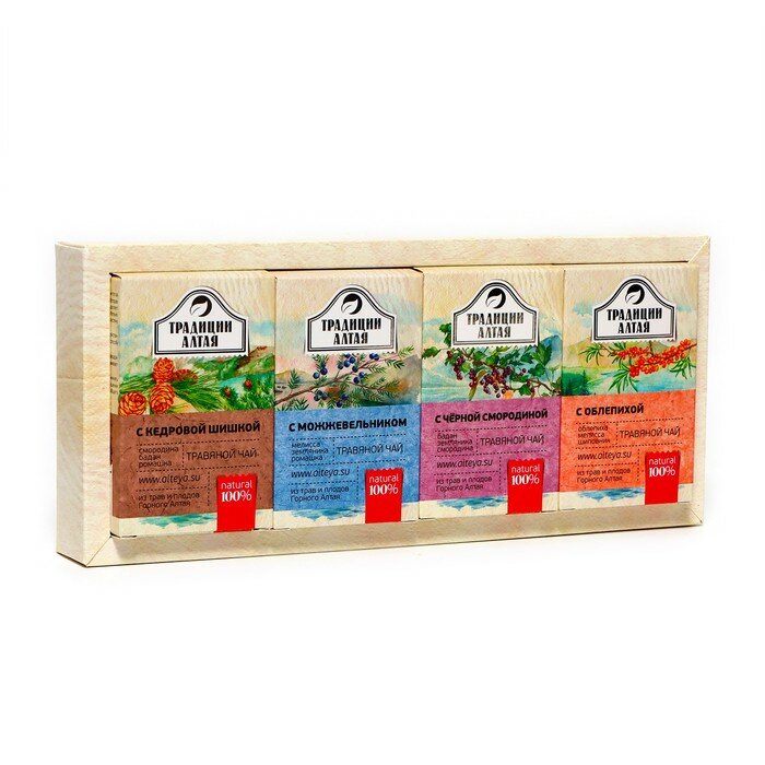 Травяные чаи обладают неповторимым натуральным вкусом и ароматом, а обогащенные ягодами и плодами, собранными в экологически чистых районах Алтая - превращаются в кладезь полезных веществ.В состав подарочного набора входят 4 вида травяных чаев по 50 г: Травяной чай 'С кедровой шишкой'Состав: лист смородины, лист бадана толстолистного, лапка шишки кедровой, цветки ромашки, трава душицы.Травяной чай 'С черной смородиной'Состав: лист бадана, лист земляники, лист смородины, трава душицы, ягоды смородины.Травяной чай 'С облепихой'Состав: плоды облепихи, лист облепихи, мелисса трава, плоды шиповника.Травяной чай 'С можжевельником'Состав: мелисса трава, лист земляники, цветки ромашки, можжевельника шишка, кора дуба, цветки липы. Компоненты 1 чайную ложку травяного чая залить 1 стаканом кипятка, накрыть крышкой, настоять 10 - 15 минут, процедить.