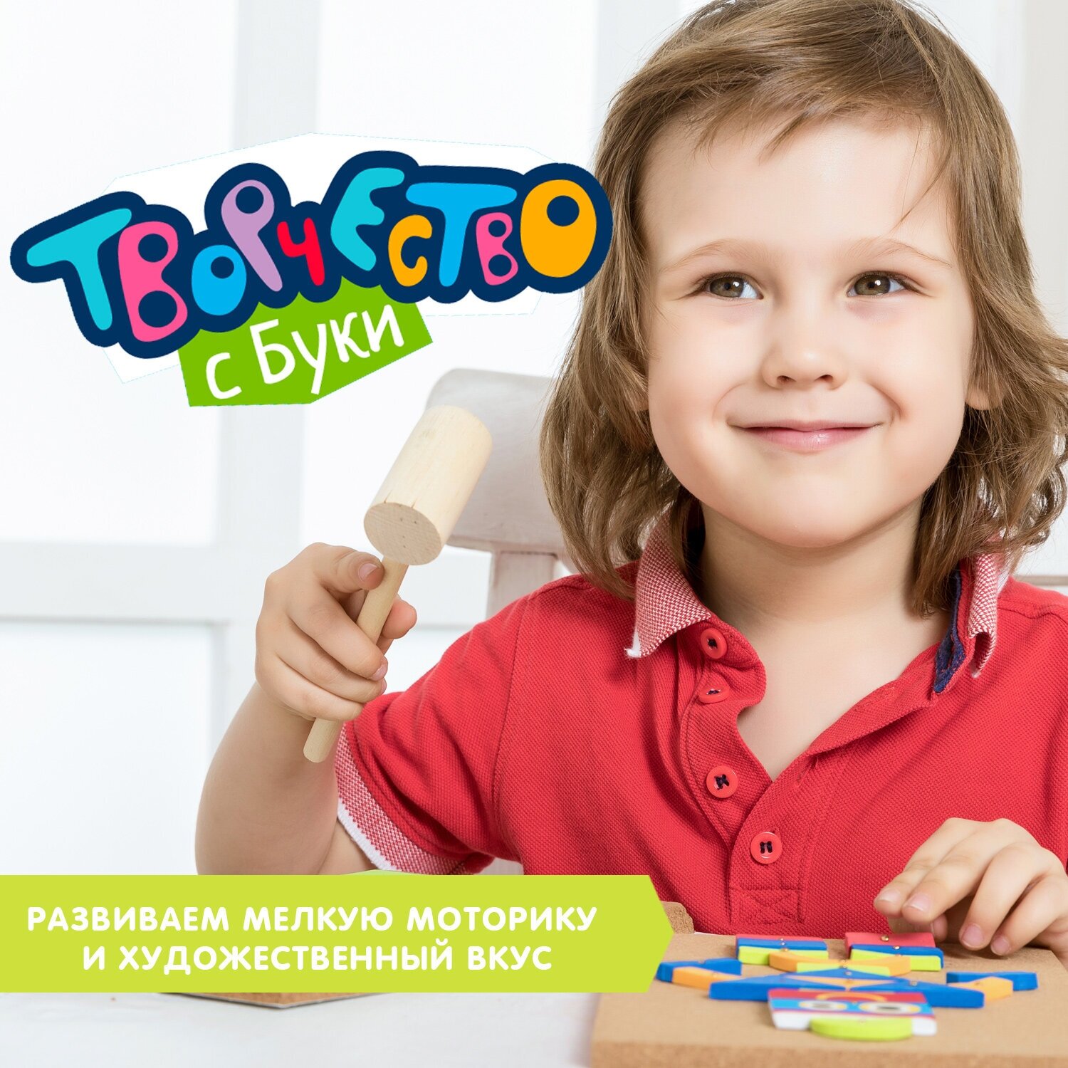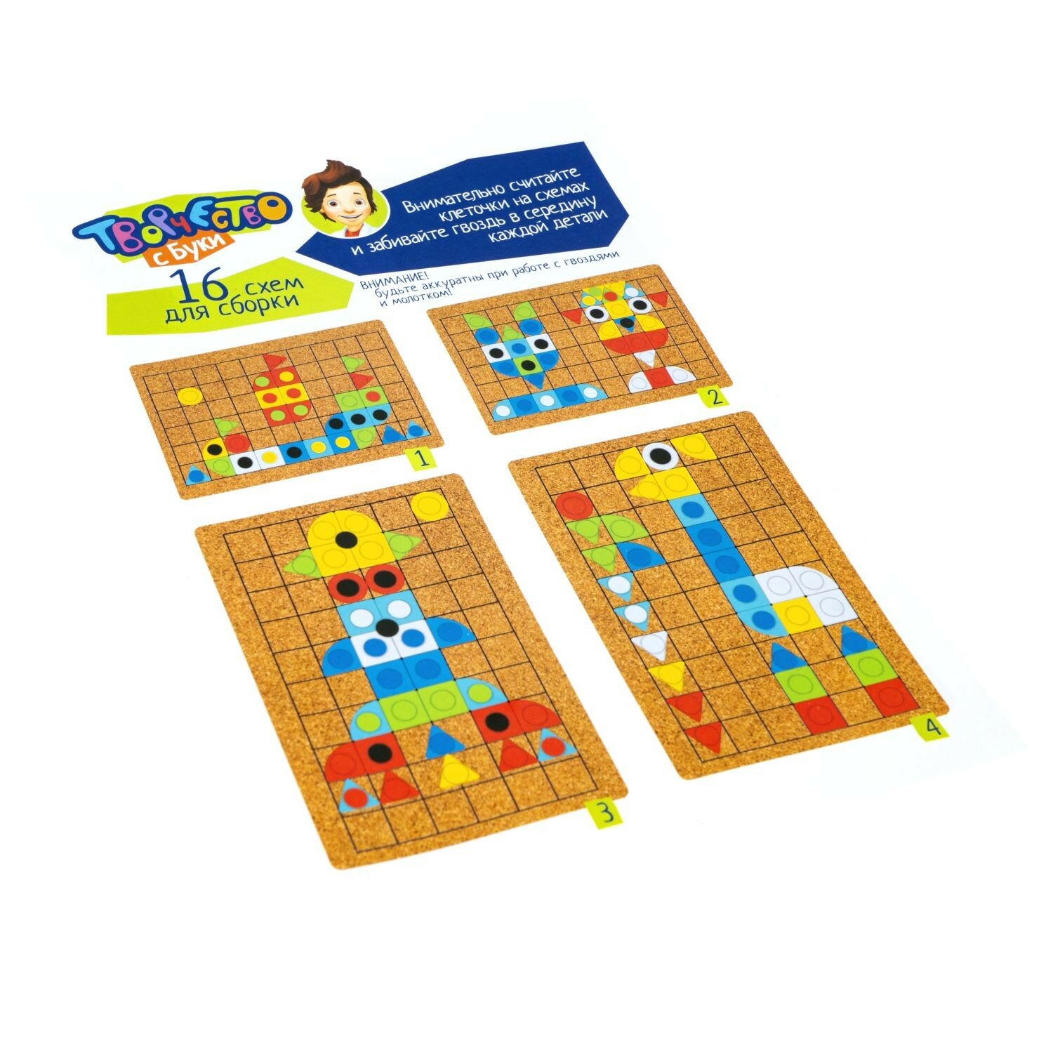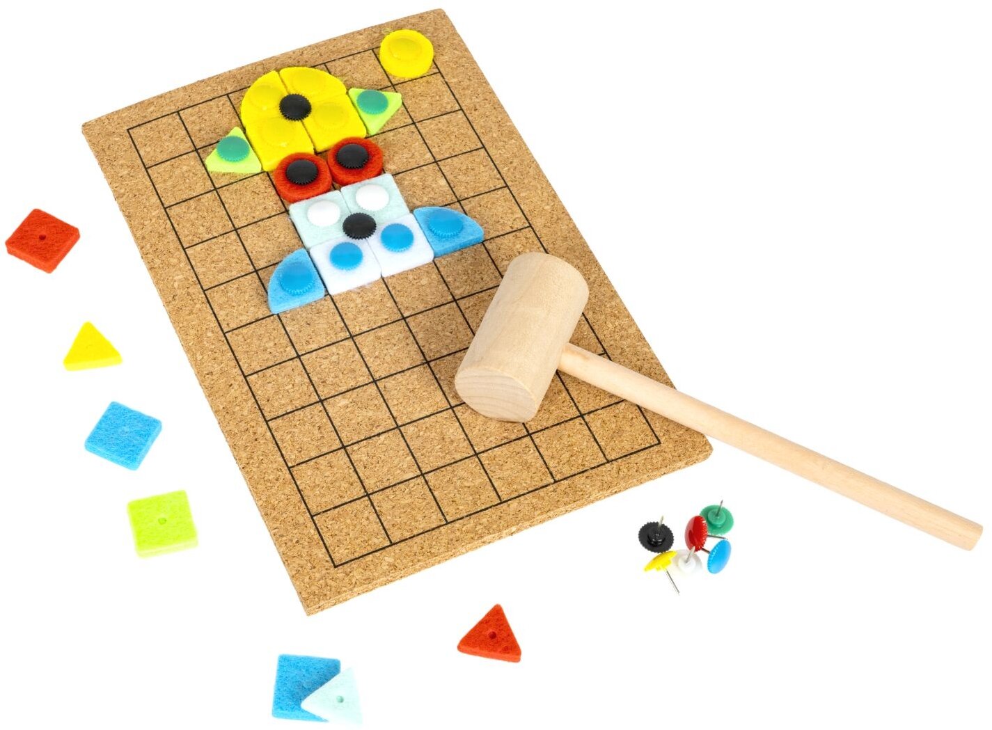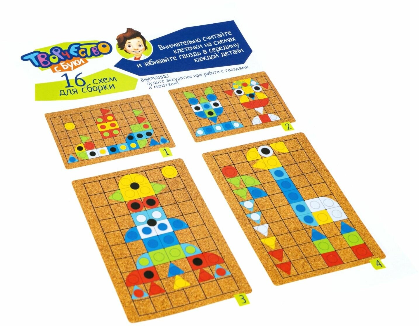 В комплекте - пробковая основа с разметкой, деревянный молоток, гвоздики, яркие детали из фетра разной формы, буклет с 16 схемами сборки. Гвоздики достаточно острые, поэтому, если Вы предложите игру маленькому ребенку нужно, чтобы он постоянно находился под Вашим контролем.