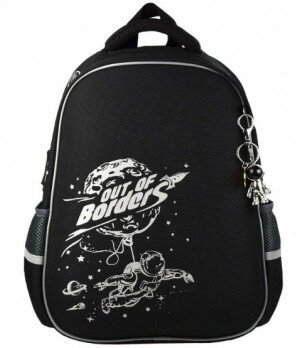 Ранец школьный. КОСМОНАВТ. Размер: 27,5x37,5x14,5 см. Материал: полиэстер, ЭВА панель. Количество отделений - 1. Внутренняя организация: мягкие разделители, резинка-фиксатор, сетчатый карман. Застёжка - молния. Материал собачки: лента репсовая. Форма собачки: хляст. Количество наружных карманов - 2. Тип спинки - формоустойчивая спинка из сетчатой ткани и поролона. Тип дна - с пластиковыми ножками. Отделка: высокая светоотражающая печать. Цвет - черный, серый. Особенности: брелок в комплекте, водоотталкивающая ткань, лямки, регулируемые по длине, светоотражающие элементы. Подклада: брендированная подклада. Индивидуальная упаковка: ПЭТ-пакет.