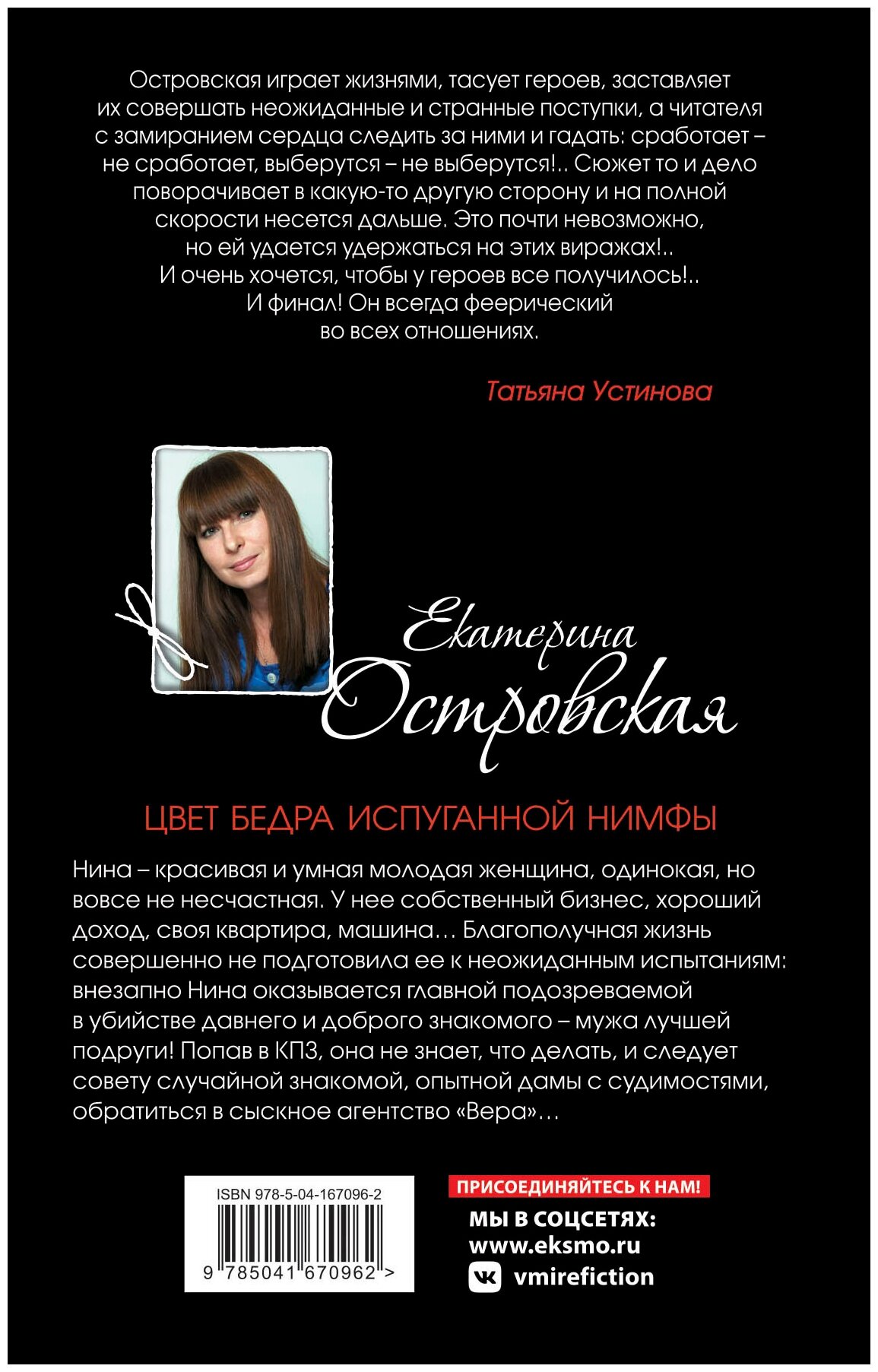 Новый роман известной писательницы Екатерины Островской "Цвет бедра испуганной нимфы", который рекомендует сама Татьяна Устинова, входит в авторский цикл "Женское лицо частного сыска". Его главная героиня Вера Бережная - владелица частного розыскного агентства "Вера", снова ведет сложное и захватывающее расследование.
