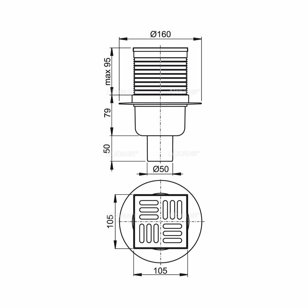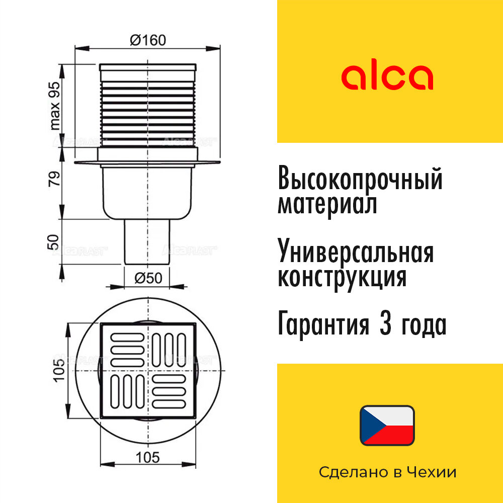AlcaPlast представляет собой сливной трап (105×105/50 мм) с прямым стоком, решеткой из нержавеющей стали и мокрым гидрозатвором. Предназначен для ванных комнат и других помещений, где предполагается частое использование с регулярным стоком воды в сливной трап, для водоотведения на уровне пола, для безбарьерного доступа. Мокрый гидрозатвор надежно защищает от проникновения запаха из канализации. Данная модель имеет изоляционный воротник для удобного монтажа укладочной гидроизоляции пола. Сифон трапа легко чистится вручную, вплоть до сточной трубы.