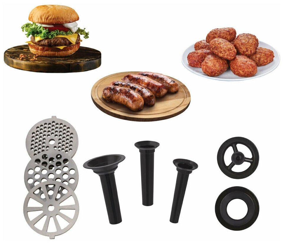 | Насадки | для мяса беф-строганов, для приготовления колбасы, для приготовления сосисок, кеббе |