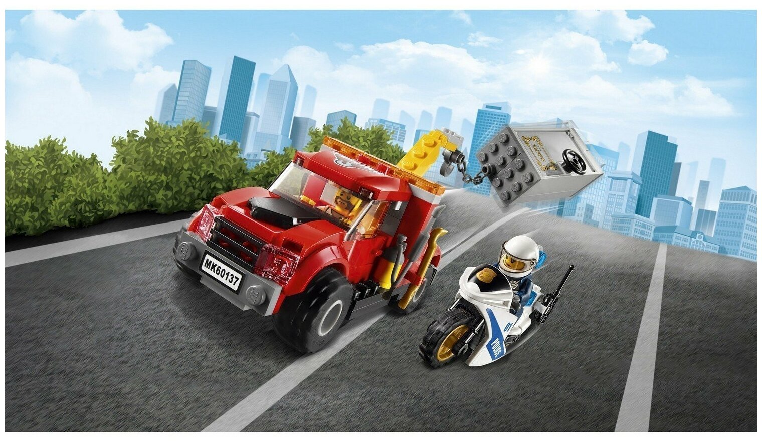 LEGO City 60137 Побег на буксировщике - набор, который сможет заинтересовать подрастающего защитника. Скоро ему предстоит выбрать, какой профессиональной деятельности он посвятит свою жизнь. Вполне возможно, что оригинальный набор Lego станет идейным вдохновителем ребенка. Ему предстоит стать свидетелем еще одного дня службы доблестных полицейских, которые должны разработать план поимки предприимчивого преступника, который украл сейф! В распоряжении будущего офицера окажется мотоцикл-внедорожник и гоночный мотоцикл для того, чтобы догнать буксировщик. Отрежь ему путь и отправь воришку за решетку! Lego City - станьте гражданином игрушечного города.