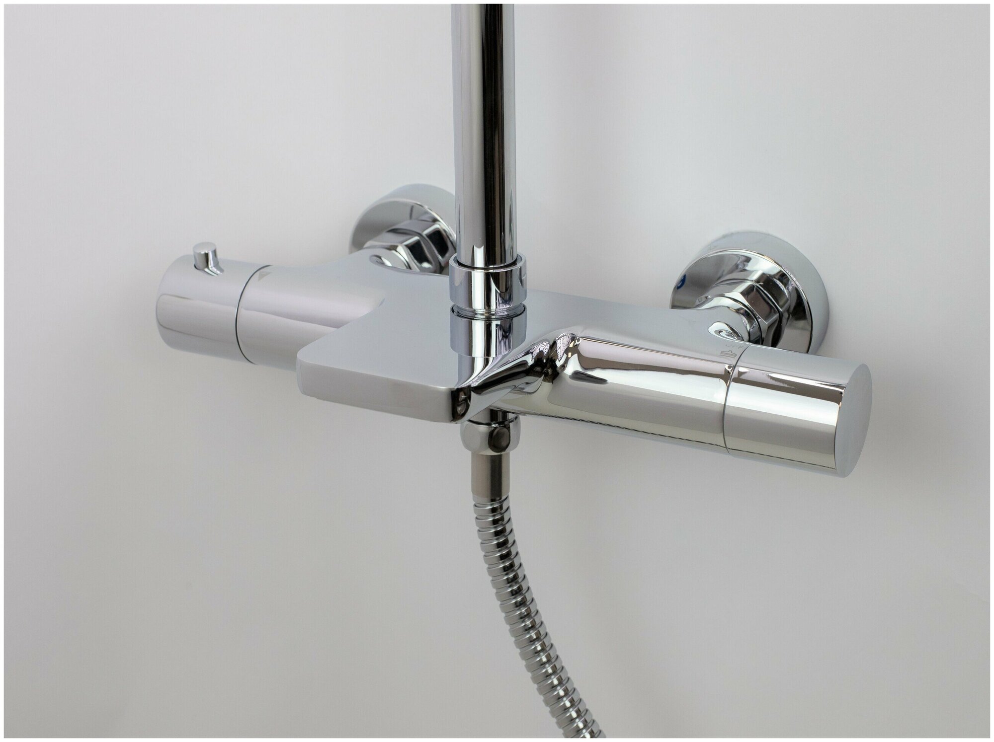 Выдвижная телескопическая стойка (нерж. сталь, хром): высота функциональная 750 -1300 мм, диаметр 22 мм, вылет верхнего душа 340 мм, держатель лейки плавающий FightFix. Лейка верхнего душа (ABS-пластик, хром) : на подвижном шарнире, диаметр 225 мм. Форсунки Self-Clean Device, Eco system. Ручная лейка: диаметр 110 мм, 3 режима. Форсунки Self-Clean Device, Eco system. Термостатный смеситель с каскадным изливом: картридж трехконтурный с переключателем в одной рукоятке, ограничитель температуры 38 градусов, защитные сетки и обратные клапаны (интегрированы в корпус смесителя). Комплектация: душевой шланг 150 см (в мет. оплетке), монтажный комплект.