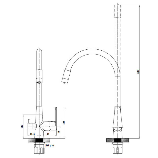 - Излив: поворотный, гибкий Epdm резина, с каналом для питьевой воды.