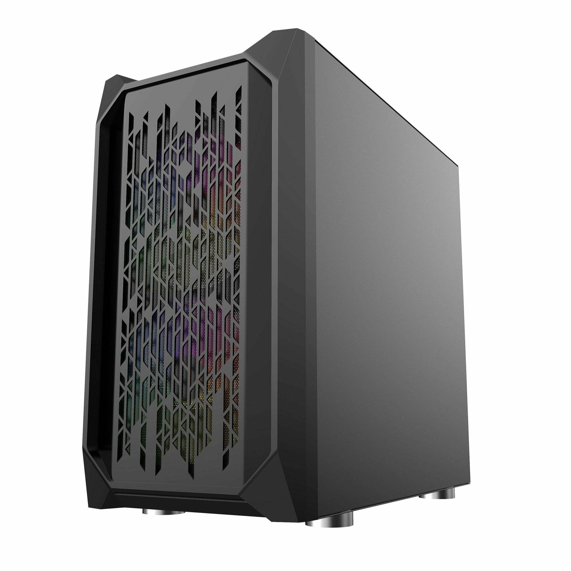 Удобный, не большой корпус. Башенный кулер (155мм) встал отлично, для трех вентиляторной видеокарты (310мм) место полно. В комплекте 3 вентилятора (1х120 и 2х140) RGB (Цвет не меняется, статичная радуга), закаленное стекло, сетчатый фильтр сверху (на крепких магнитах). Вентиляторы можно подключить как в материнскую плату (3pin, контроль по мощности), так и от блока питания (Molex, вращение по максимуму без контроля). Вентиляторы слабоватые (от 0 до 1000 rpm). В моем случаи башня на ЦП под нагрузкой доходит до 1500 rpm, и происходит закупорка горячего воздуха ссади. Решил поставить 1х120 на верх в том районе. Проблема ушла. На ножки наклеена противоскользящая основа (как на термо-кружках) , отсоединяющаяся каретка для HDD. Много отверстий для прокладки проводов. Смотрится классно и красиво. Продувается полностью за счет сеток.