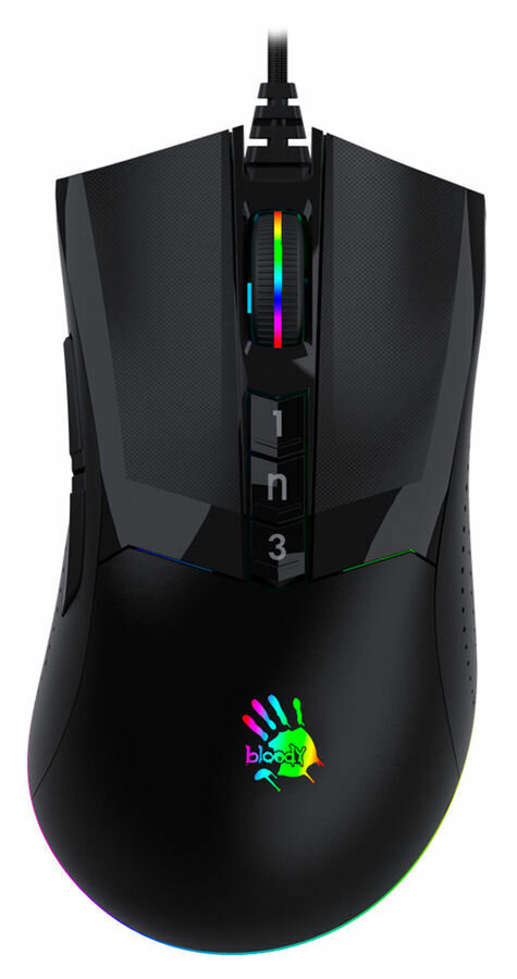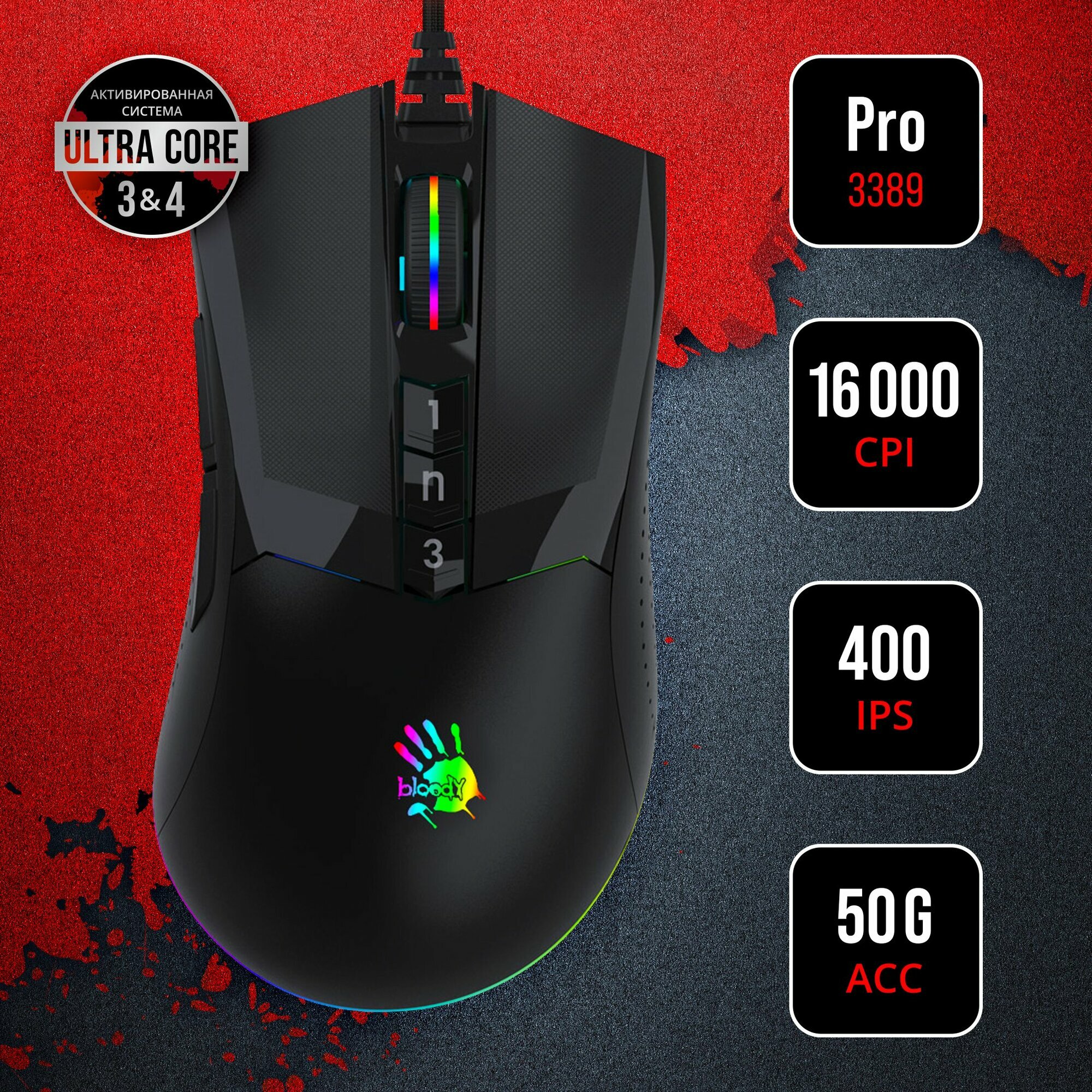 Мышь проводная A4Tech – игровая элегантная модель с черным корпусом. RGB-подсветка превращает полезное устройство в яркий элемент декора. А несколько режимов датчика до 16000 dpi позволяет подобрать оптимальную для игры скорость движения и отклика на ваши команды.