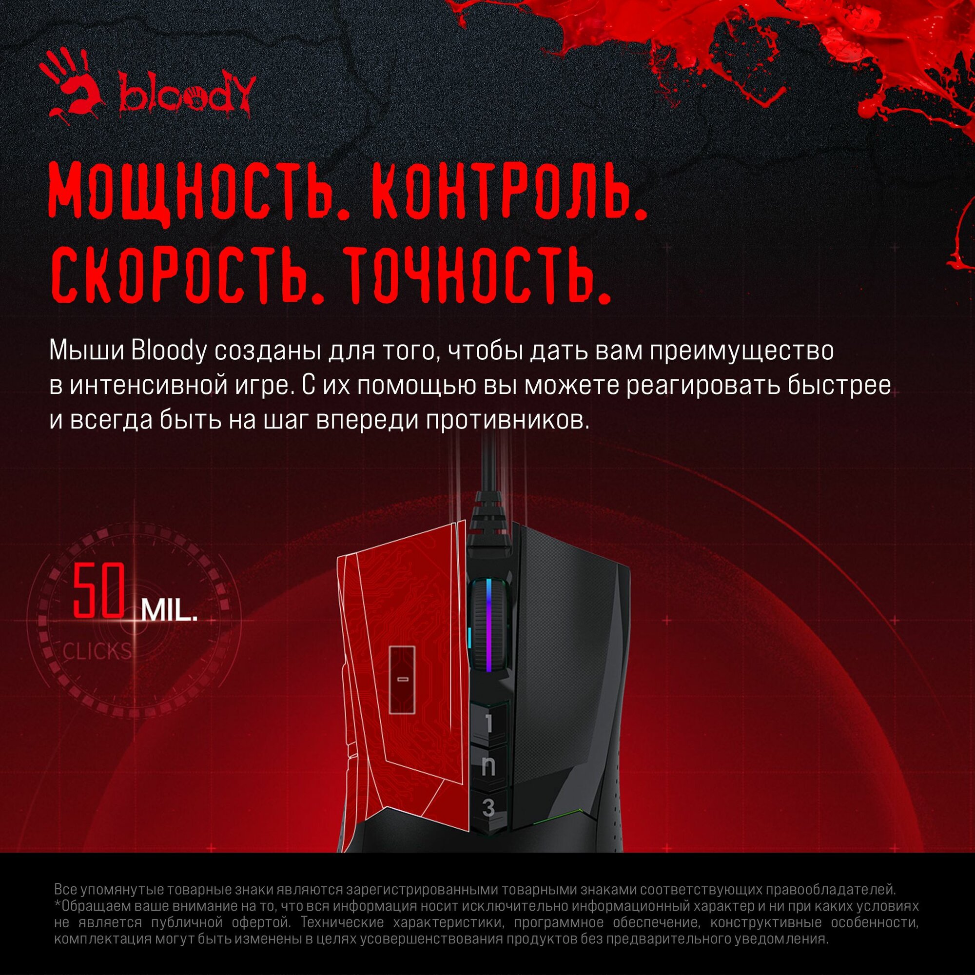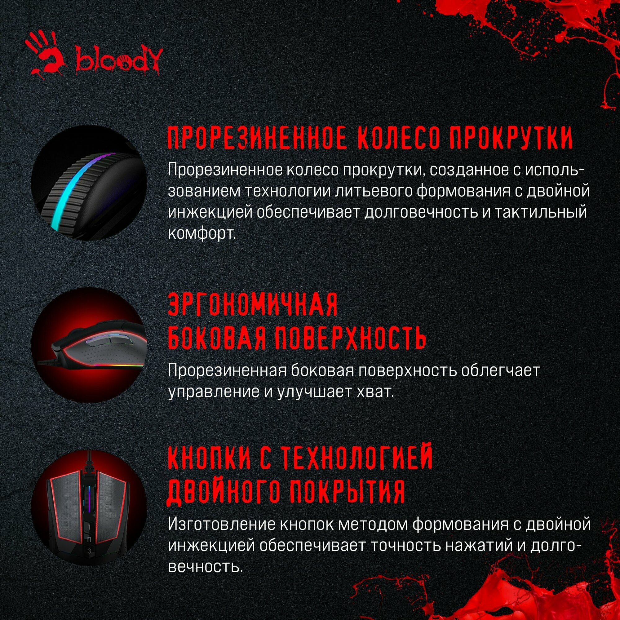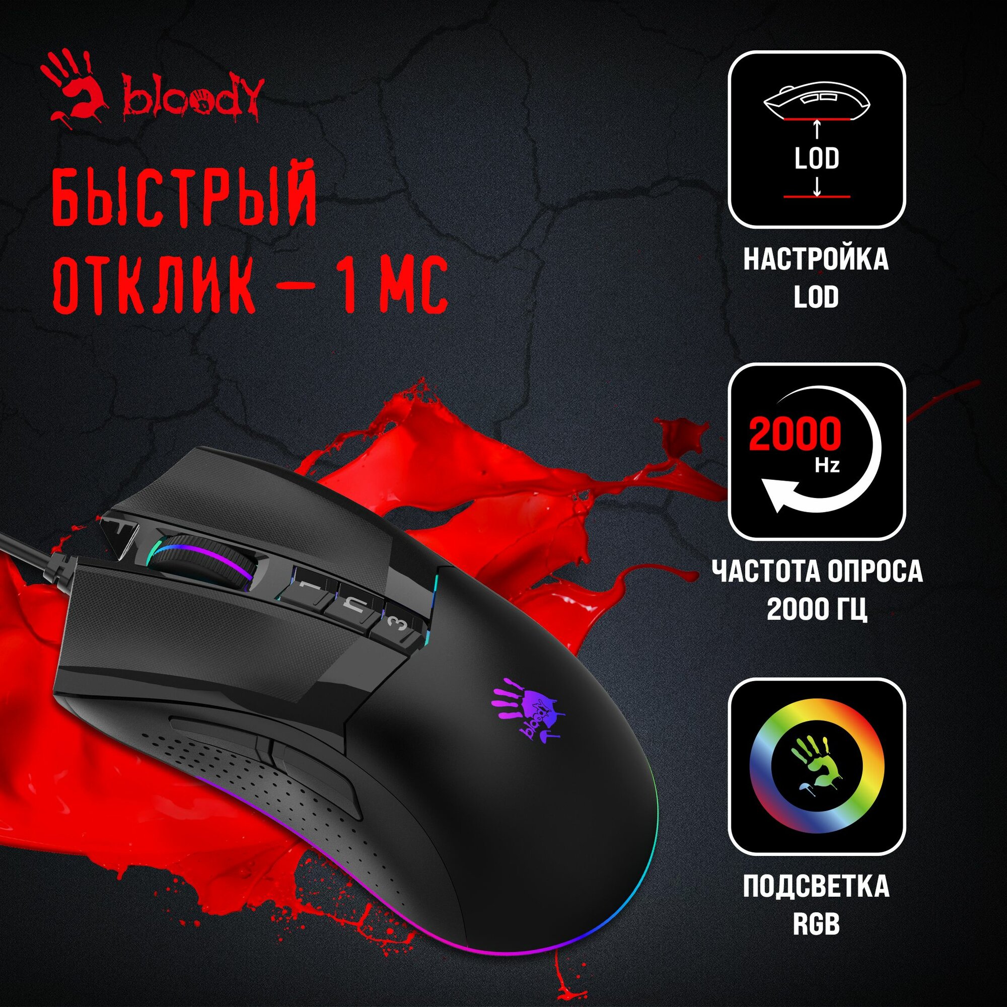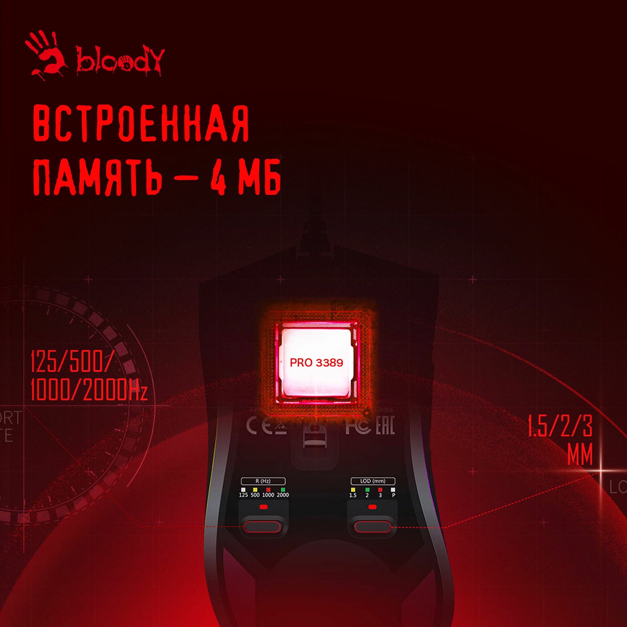 | Особенности | Игровой сенсор 3389, регулируемая высота отрыва, металлические ножки. при установке ПО Bloody7, уровни core3,4 активированы бесплатно |