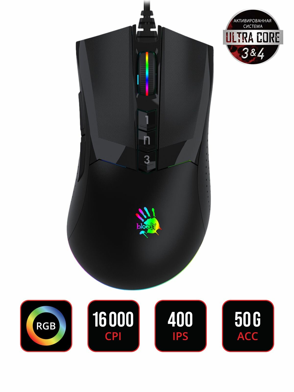 | Прочее | Подсветка, есть, Тип подсветки, RGB, MTBF, 50000000 кликов, Особенности, Игровой сенсор 3389, регулируемая высота отрыва, металлические ножки. при установке ПО Bloody7, уровни core3,4 активированы бесплатно |