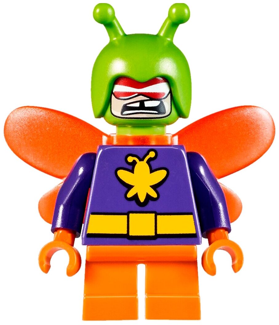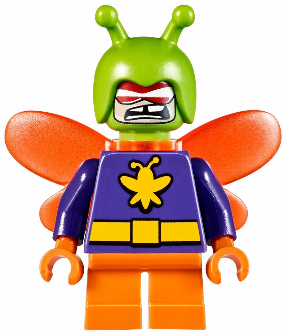 В наборе Лего 76069 Вы найдёте детали для создания микромоделей транспортных средств, принадлежащих героям вселенной DC Comics. Машина Мотылька-убийцы выполнена из салатово-фиолетовых элементов. Спереди располагается капот, напоминающий голову насекомого с огромными красными глазами и хоботком-пушкой. За ним устроена кабина водителя, прикрытая зеленоватым лобовым стеклом. По бокам от кабины видны овальные крылья, с помощью которых машина может подниматься в воздух и парить над землёй.