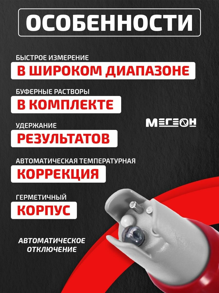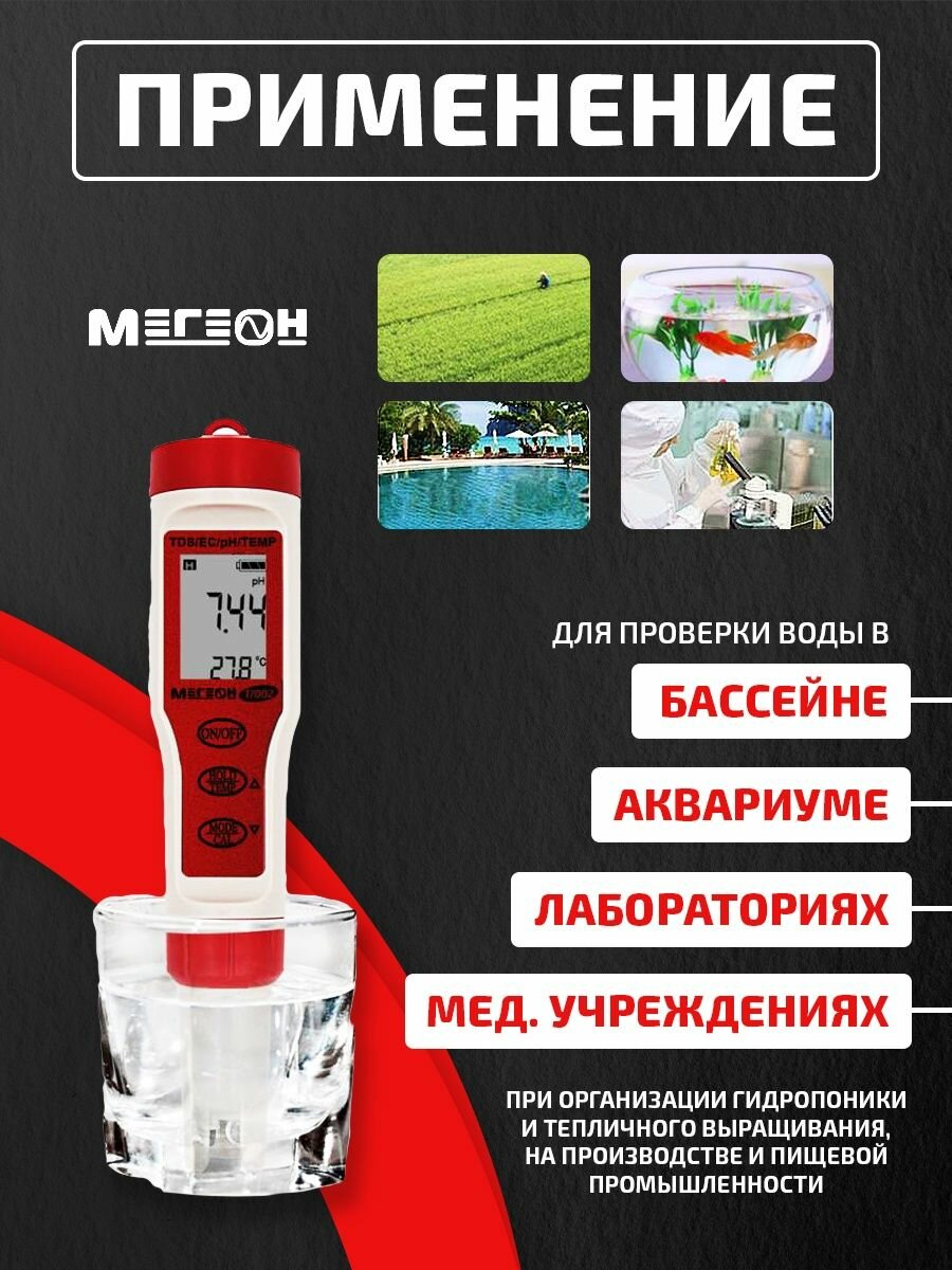 Мегеон - это комбинированный тестер для исследования водных растворов, сочетающий в себе сразу 4 измерителя: кондуктометр, солемер, термометр и pH- метр. Модель успешно может применяться для измерения электропроводности, температуры, минерализации питьевой воды, а также определения её среды. Он идеально подходит для контроля состояния качества водопроводных жидкостей и проверки эффективности работы систем фильтрации. Корпус изготовлен из качественного пластика и получил компактные размеры. Функция автоматической компенсации температуры, а также возможность удерживать полученные результаты на дисплее делают эксплуатацию простой и удобной. Изделие имеет широкий спектр применения и будет необходимо для проверки воды в бассейне и аквариуме, в лабораториях и медицинских учреждениях, при организации гидропоники и тепличного выращивания, на производстве и пищевой промышленности. Будет незаменимым помощником у профессионалов и любителей.