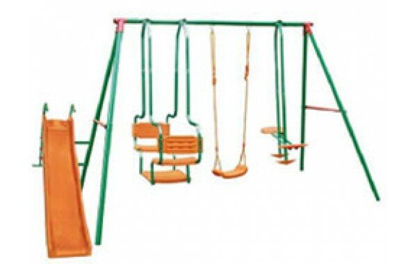 Детский комплекс с горкой DFC . Комплекс включает в себя: качели, горку, двухместные качели и гондолу. Регулируемые веревки для качелей. Спускной желоб и сидение качелей- пластик. Подходит для детей: 3-10 лет.