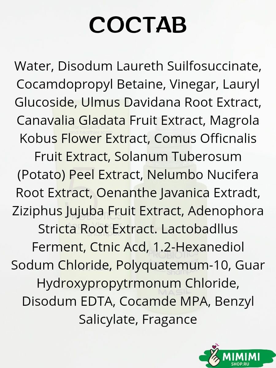 | Состав | Water, Disodum Laureth Suilfosuccinate, Cocamdopropyl Betaine, Vinegar, Lauryl Glucoside, Ulmus Davidana Root Extract, Canavalia Gladata Fruit Extract, Magrola Kobus Flower Extract, Comus Officnalis Fruit Extract, Solanum Tuberosum (Potato) Peel Extract, Nelumbo Nucifera Root Extract, Oenanthe Javanica Extradt, Ziziphus Jujuba Fruit Extract, Adenophora Stricta Root Extract. Lactobadllus Ferment, Ctnic Acd, 1.2-Hexanediol Sodum Chloride, Polyquatemum-10, Guar Hydroxypropytrmonum Chloride, Disodum EDTA, Cocamde MPA, Benzyl Salicylate, Fragance |