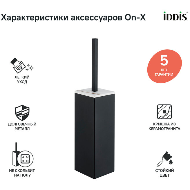 Вдохновленная актуальными трендами из мира дизайна коллекция On-X. Естественная гармония черного цвета и природных текстур делает аксессуары стильным интерьерным решением. Крышка ерша On-X из белого керамогранита воспроизводит структуру натурального камня. Узор на каждом продукте уникален.• Мягкие резиновые накладки в основании колбы ерша IDDIS® фиксируют изделие на любой ровной поверхности. Это надежно защитит напольное покрытие от механических повреждений и царапин. • Черное покрытие нанесено методом электролиза. Технология гарантирует высокую стойкость цвета при негативном воздействии внешних факторов.• Щетка ерша IDDIS® практичного черного цвета. Внутренняя колба из черного ABS-пластика упрощает уход за аксессуаром: она легко вынимается и моется, не впитывает запахи.• Гарантия на аксессуары IDDIS® – 5 лет. (с) Авторский текст, март 2022 г.