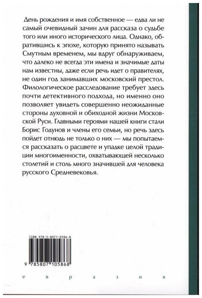 День рождения и имя собственное - едва ли не самый очевидный зачин для рассказа о судьбе того или иного исторического лица. Однако обратившись к эпохе, которую принято называть Смутным временем, мы вдруг обнаруживаем, что далеко не всегда эти имена и значимые даты нам известны, даже если речь идет о правителях, не один год занимавших московский престол. Филологическое расследование требует здесь почти детективного подхода, но именно оно позволяет увидеть совершенно неожиданные стороны духовной и обиходной жизни Московской Руси. Главными героями нашей книги стали Борис Годунов и члены его семьи, но речь здесь пойдет отнюдь не только о них - мы попытаемся рассказать о расцвете и упадке целой традиции многоименности, охватывающей несколько столетий и столь много значившей для человека русского Средневековья.