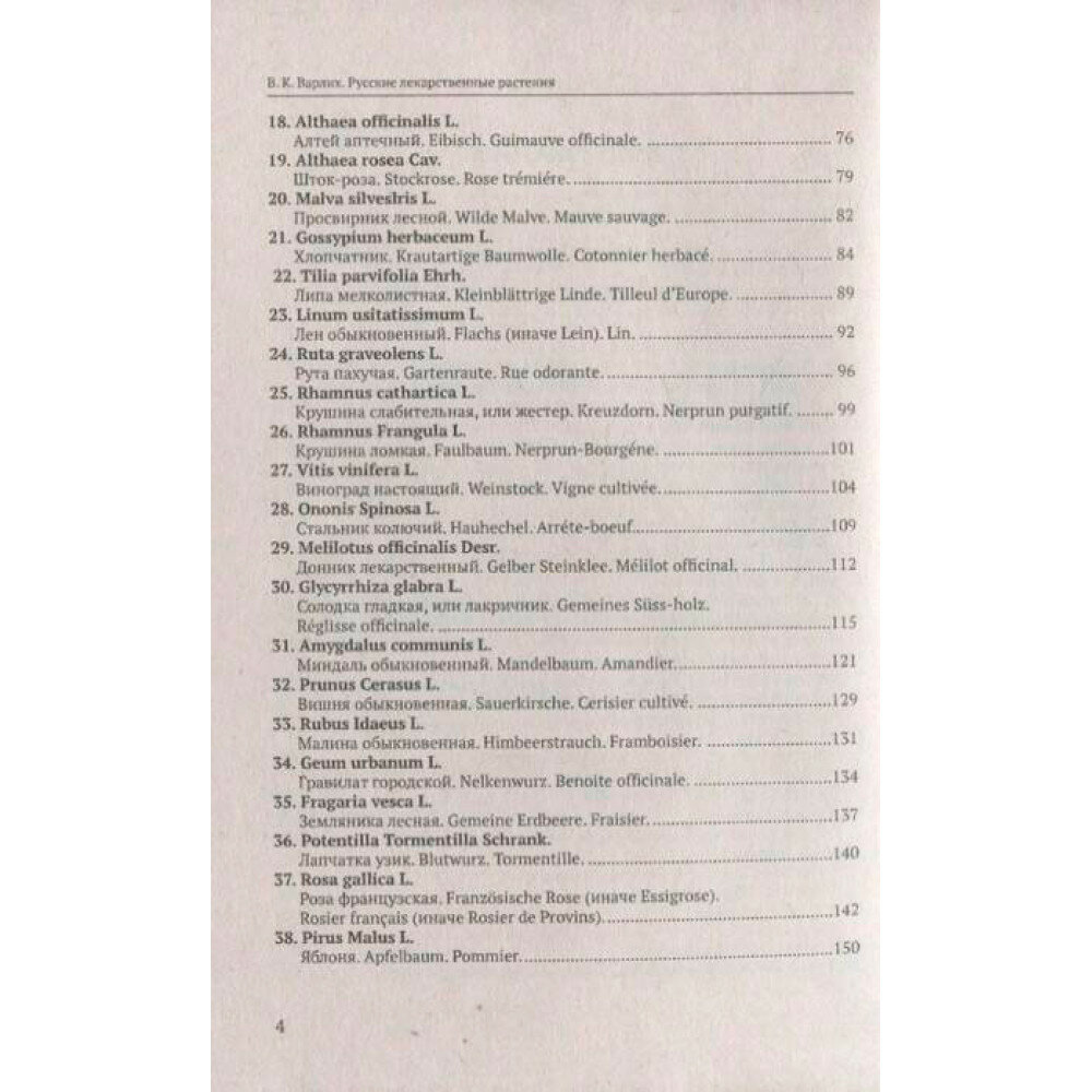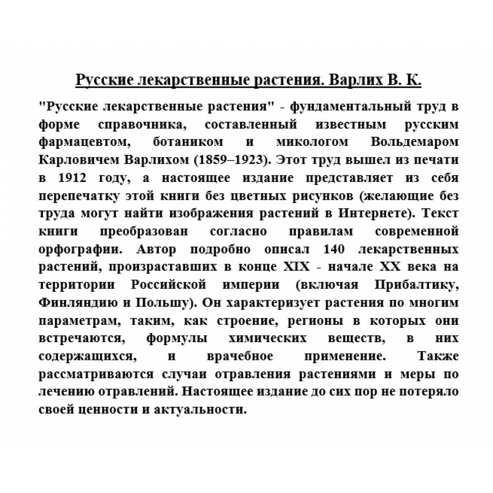 "Русские лекарственные растения" - фундаментальный труд в форме справочника, составленный известным русским фармацевтом, ботаником и микологом Вольдемаром Карловичем Варлихом (1859-1923). Этот труд вышел из печати в 1912 году, а настоящее издание представляет из себя перепечатку этой книги без цветных рисунков (желающие без труда могут найти изображения растений в Интернете). Текст книги преобразован согласно правилам современной орфографии. Автор подробно описал 140 лекарственных растений, произраставших в конце XIX - начале XX века на территории Российской империи (включая Прибалтику, Финляндию и Польшу). Он характеризует растения по многим параметрам, таким, как строение, регионы в которых они встречаются, формулы химических веществ, в них содержащихся, и врачебное применение. Также рассматриваются случаи отравления растениями и меры по лечению отравлений. Настоящее издание до сих пор не потеряло своей ценности и актуальности.