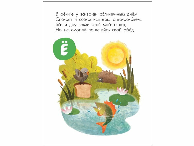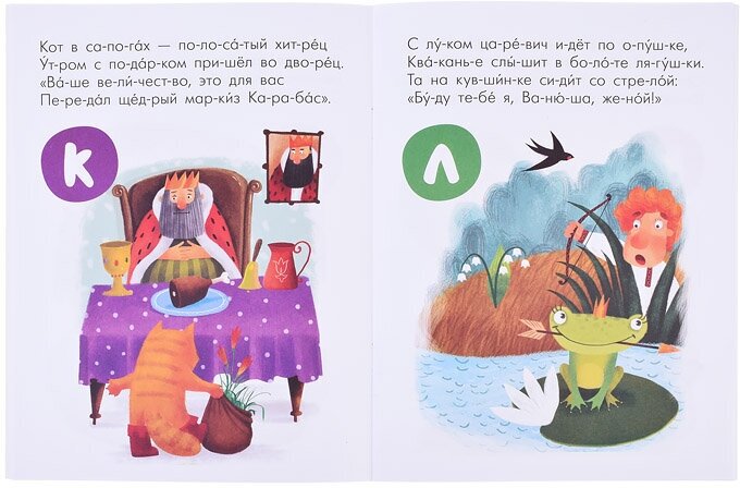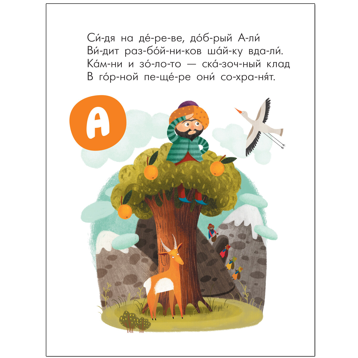 В книге «Сказки» ребенка ждут веселые стихи про разных сказочных героев, расположенные в алфавитном порядке, — одна страничка, одна буква и одно стихотворение. Слова разделены на слоги, в них проставлены ударения — для более комфортного чтения. Кроме того, помимо тренировки навыка чтения, ребенку предлагается проверить свою внимательность: рассмотреть рисунок и найти на нем еще картинки, названия которых начинаются на эту же букву.