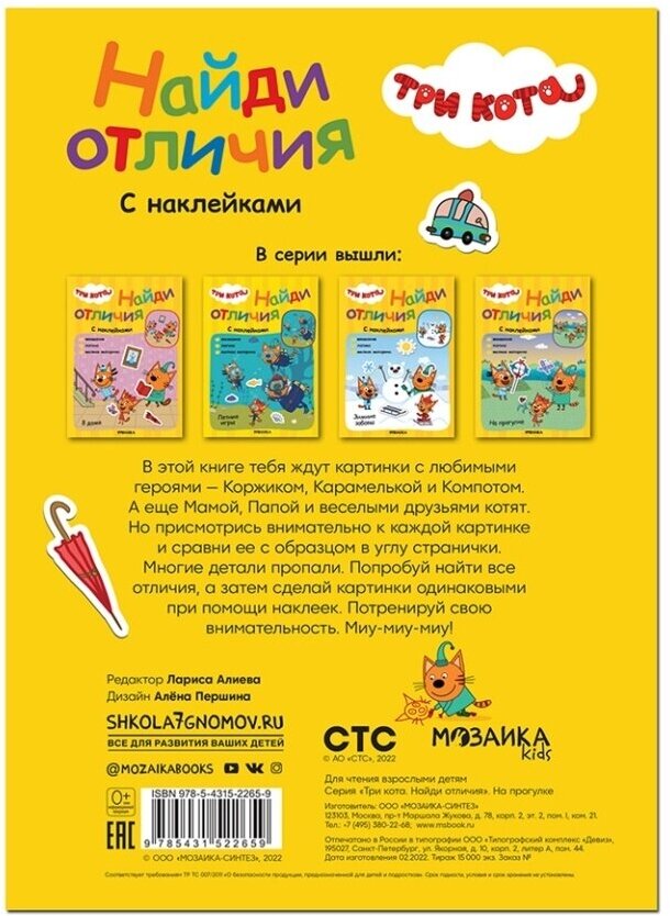 Сервис сравнения цен СкидкаГИД предлагает сравнить цены на товар «Книга: Три кота Найди отличия На прогулке (Коллектив авторов); МОЗАИКА kids, 2022»