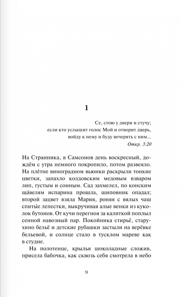 «По воздуху клубничного варенья плывут к огням веранд рогатые жуки, оса в янтарном мёде вязнет, смерть сладка, над бархатным ковром демисезонных примул, в какие Пётр-апостол уронил от Царствия Небесного ключи, гудят устало пчёлы. Вечерний звон посуд, вечерний разговор, вечерний свет»
