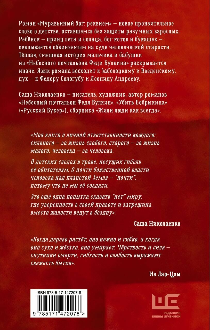 Роман "Муравьиный бог: реквием" — новое пронзительное слово о детстве, оставшемся без защиты разумных взрослых. Ребёнок — принц лета и солнца, бог котов и букашек — оказывается обвиняемым на суде человеческой старости.