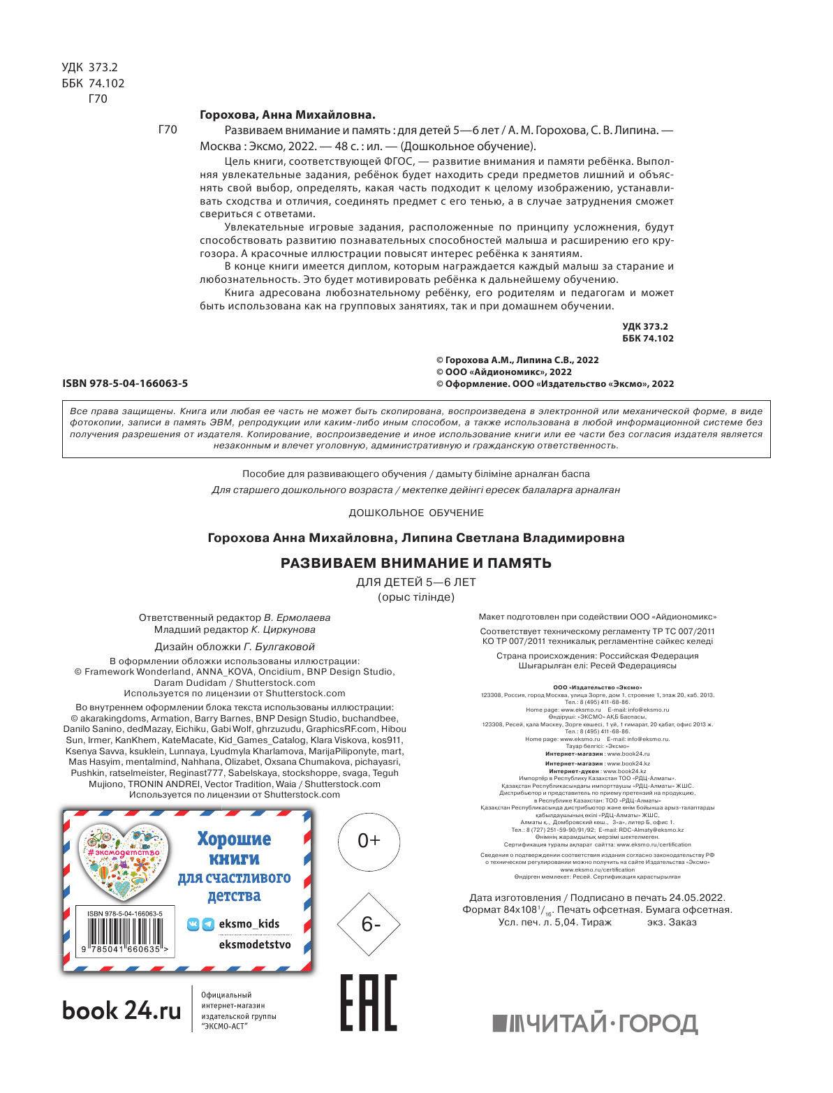 Развиваем внимание и память: для детей 5-6 лет (Липина Светлана Владимировна, Горохова Анна Михайловна); ООО "Издательство "Эксмо", 2022